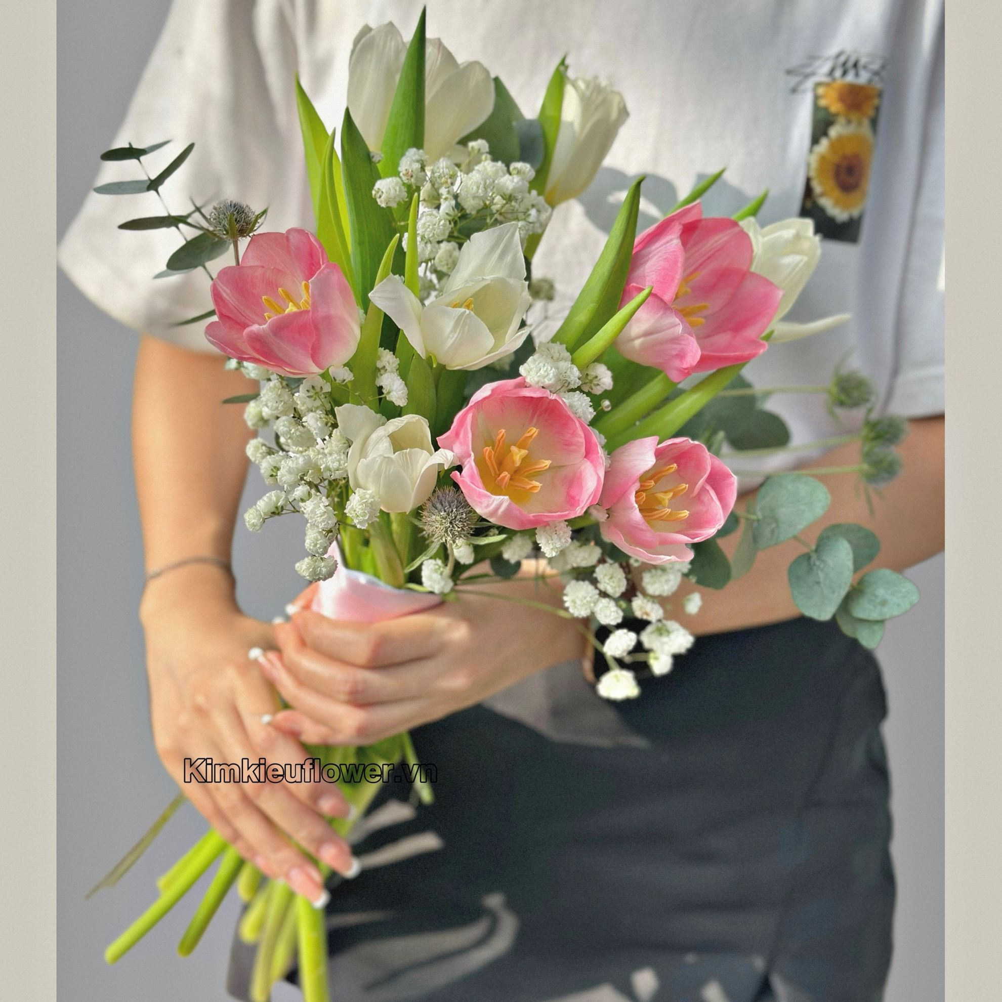 Mẫu HC85 gồm các loại hoa : + tulip trắng và hồng ( hàng nhập khẩu Hà Lan ) + và các lá phụ khác- Liên hệ KIM KIỀU FLOWER để tư vấn thiết kế mẫu hoa theo yêu cầu bạn nhé!