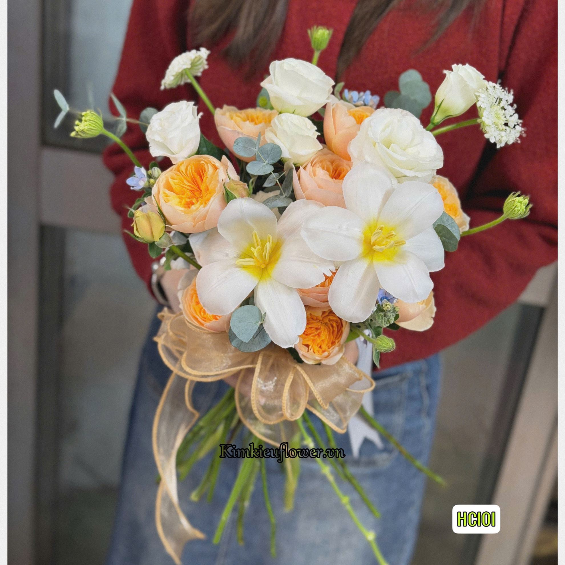Mẫu HC100 gồm các loại hoa: + Hoa hồng juliet + Tulip trắng + Cát tường trắng + Thuý châu + Sao xanh + và các lá phụ khác - Liên hệ KIM KIỀU FLOWER để tư vấn thiết kế mẫu hoa theo yêu cầu bạn nhé!