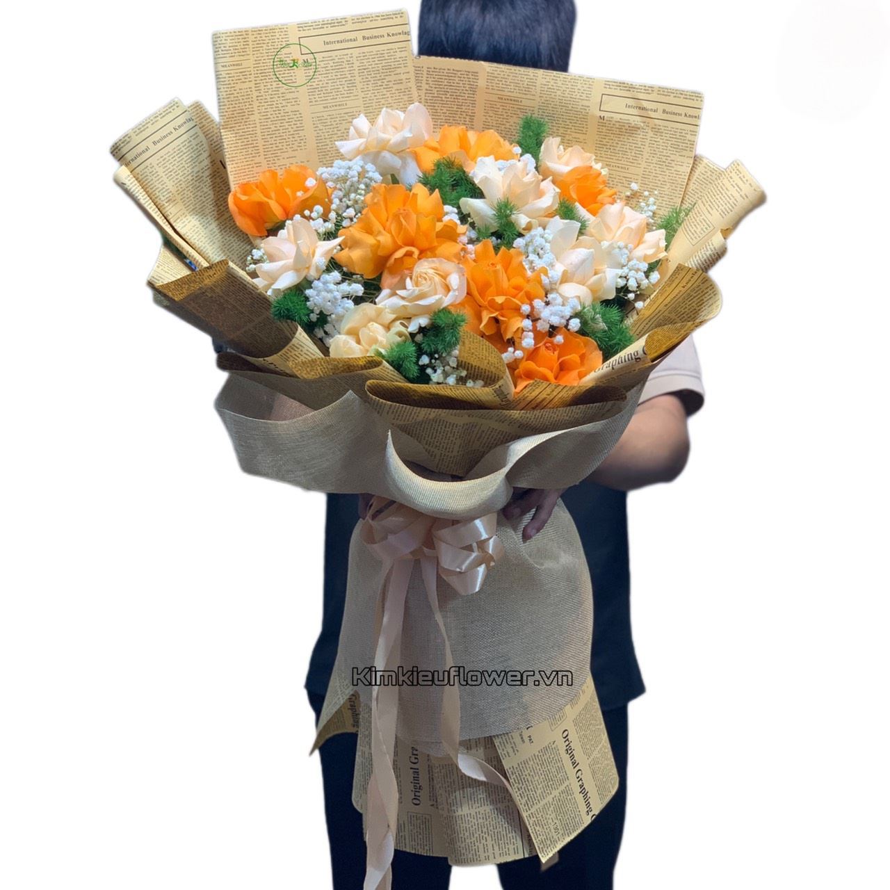 Mẫu HB428 gồm các loại hoa: + hoa hồng cam quốc vương + hoa hồng mỡ gà + và các lá phụ khác - Liên hệ KIM KIỀU FLOWER để tư vấn thiết kế mẫu hoa theo yêu cầu bạn nhé!