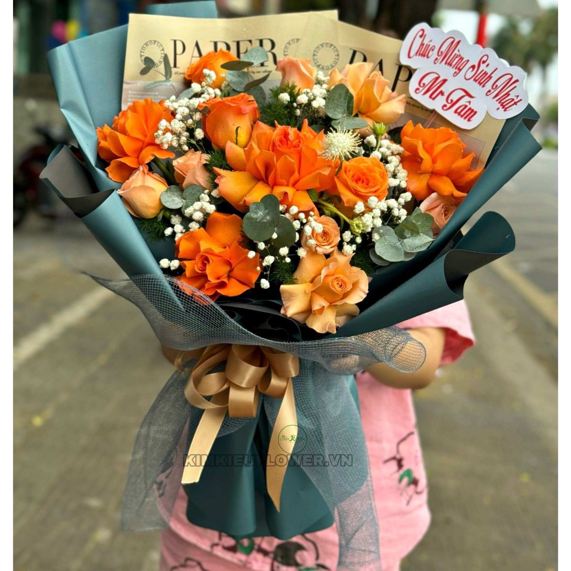 Bó hoa HB621 gồm: + 14 hoa hồng cam + và các lá phụ khác - Liên hệ KIM KIỀU FLOWER để tư vấn thiết kế mẫu hoa theo yêu cầu bạn nhé!
