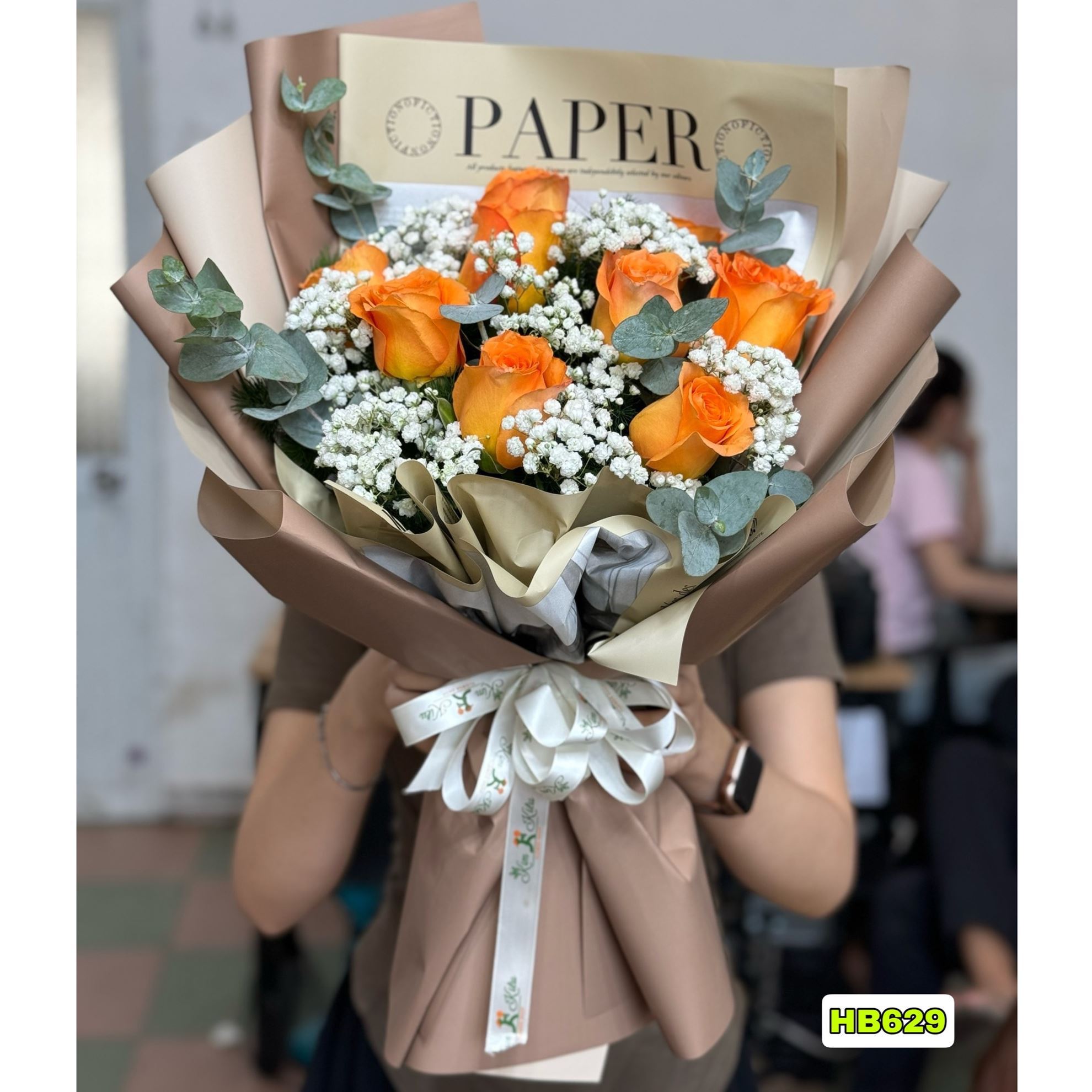 Bó hoa HB629 gồm: + 9 hoa hồng cam + và các lá phụ khác - Liên hệ KIM KIỀU FLOWER để tư vấn thiết kế mẫu hoa theo yêu cầu bạn nhé!