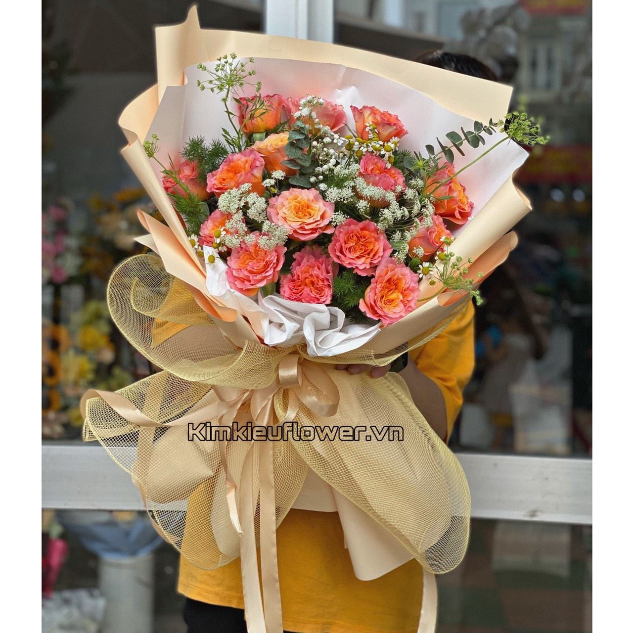 Mẫu HB427 gồm các loại hoa: + 15 hồng cam spirit + và các lá phụ khác - Liên hệ KIM KIỀU FLOWER để tư vấn thiết kế mẫu hoa theo yêu cầu bạn nhé!