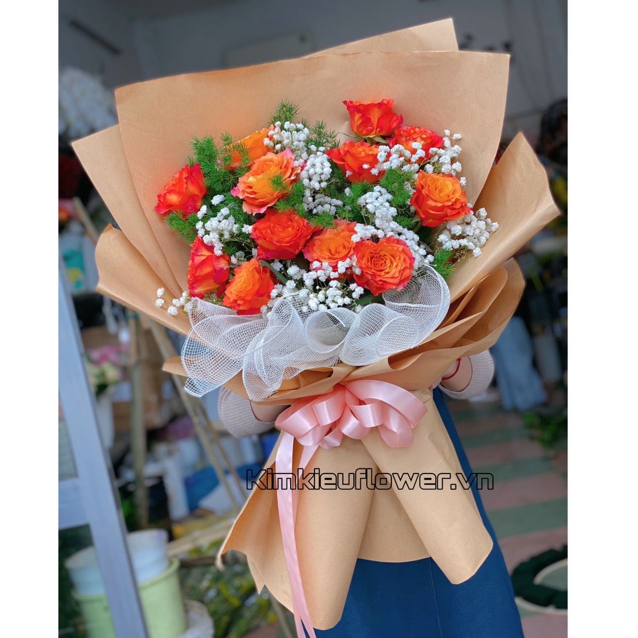 Mẫu HB434 Gồm các loại hoa: + 12 hồng cam spirit + và các lá phụ khác - Liên hệ KIM KIỀU FLOWER để tư vấn thiết kế mẫu hoa theo yêu cầu bạn nhé!