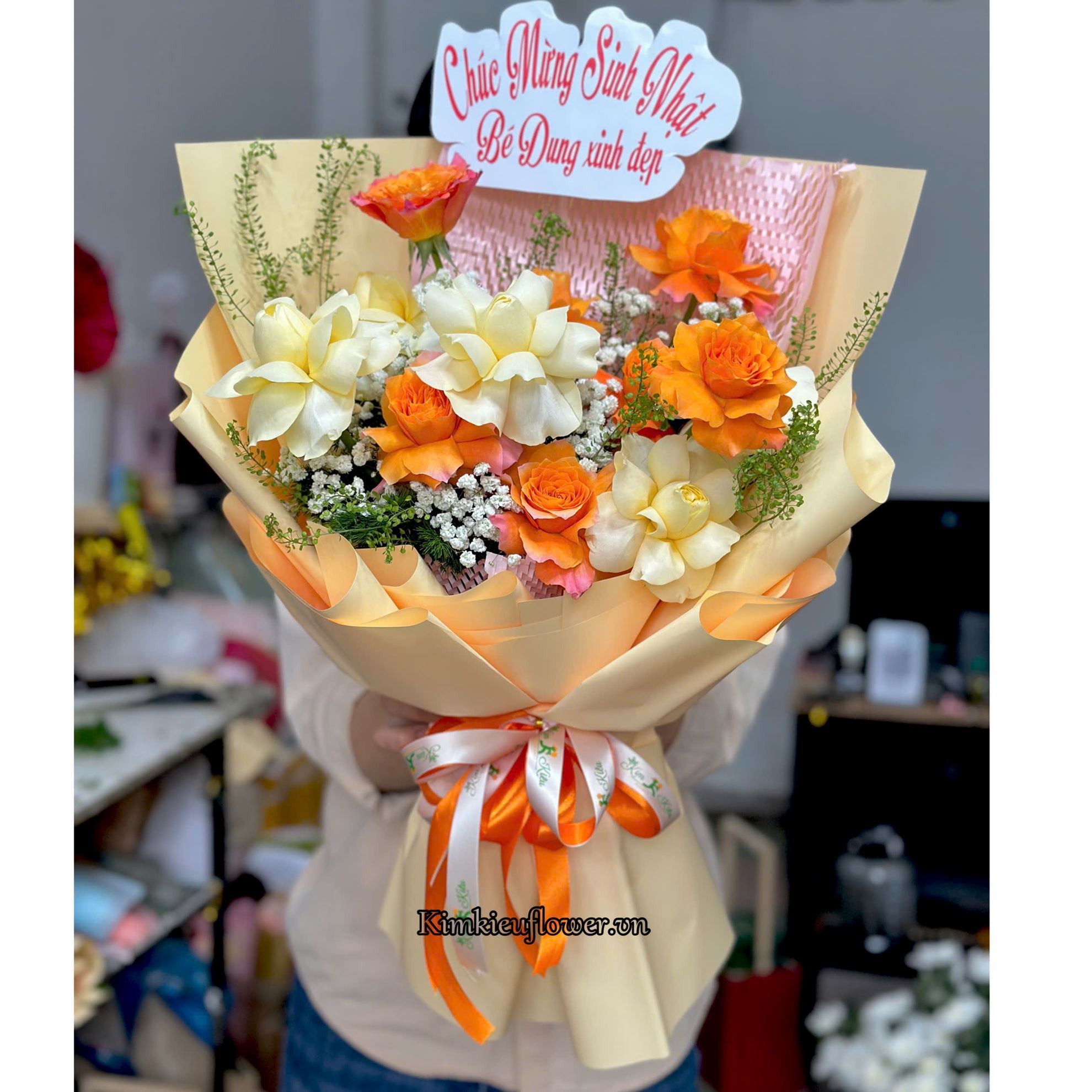 Mẫu HB745 gồm các loại hoa: + 7 hồng cam spirit + 5 hồng victor vàng + và các lá phụ khác - Liên hệ KIM KIỀU FLOWER để tư vấn thiết kế mẫu hoa theo yêu cầu bạn nhé!