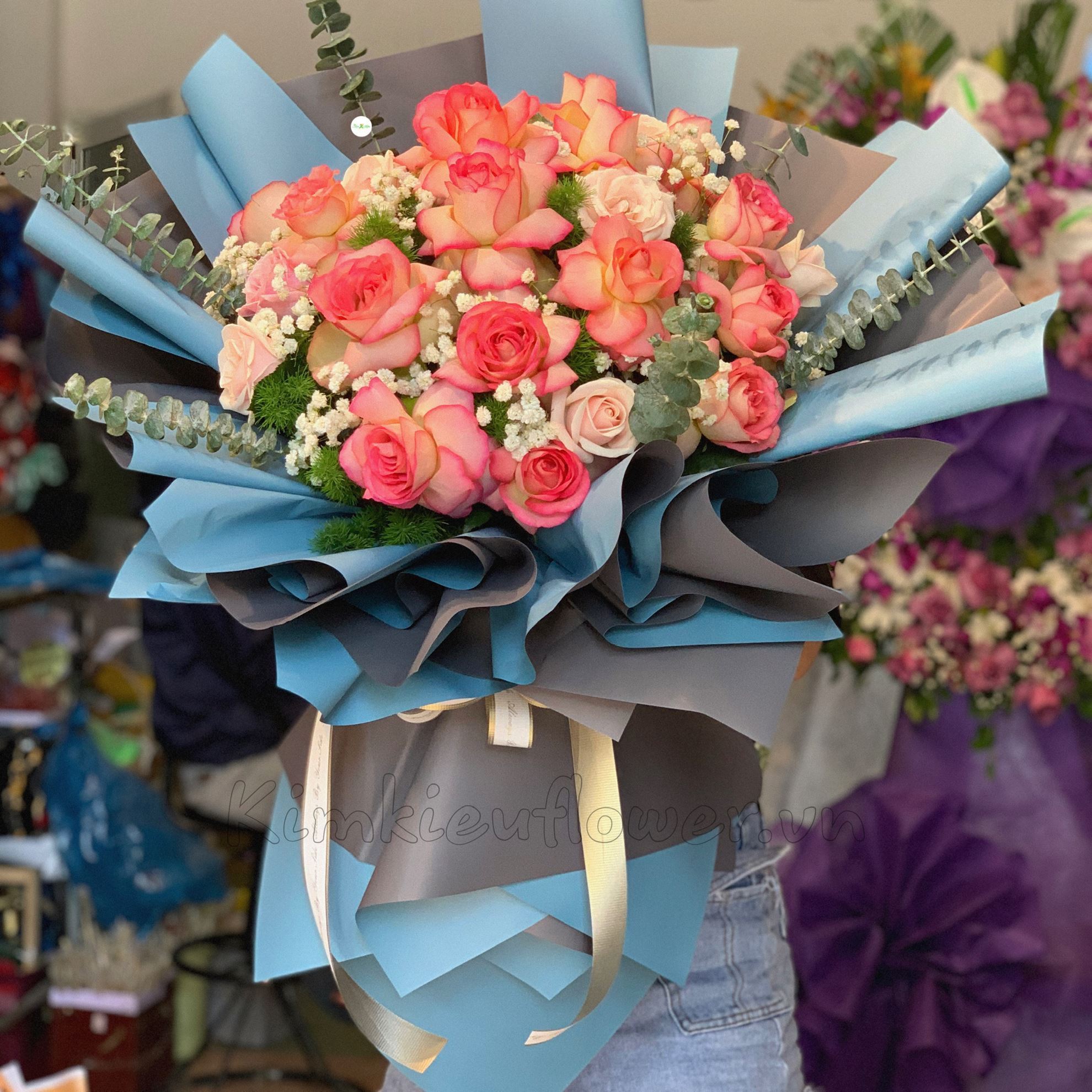 Mẫu HB161 gồm các loại hoa: + 16 hoa hồng đại hỷ + 13 hoa hồng pastel + và các lá phụ khác- Liên hệ KIM KIỀU FLOWER để tư vấn thiết kế mẫu hoa theo yêu cầu bạn nhé!
