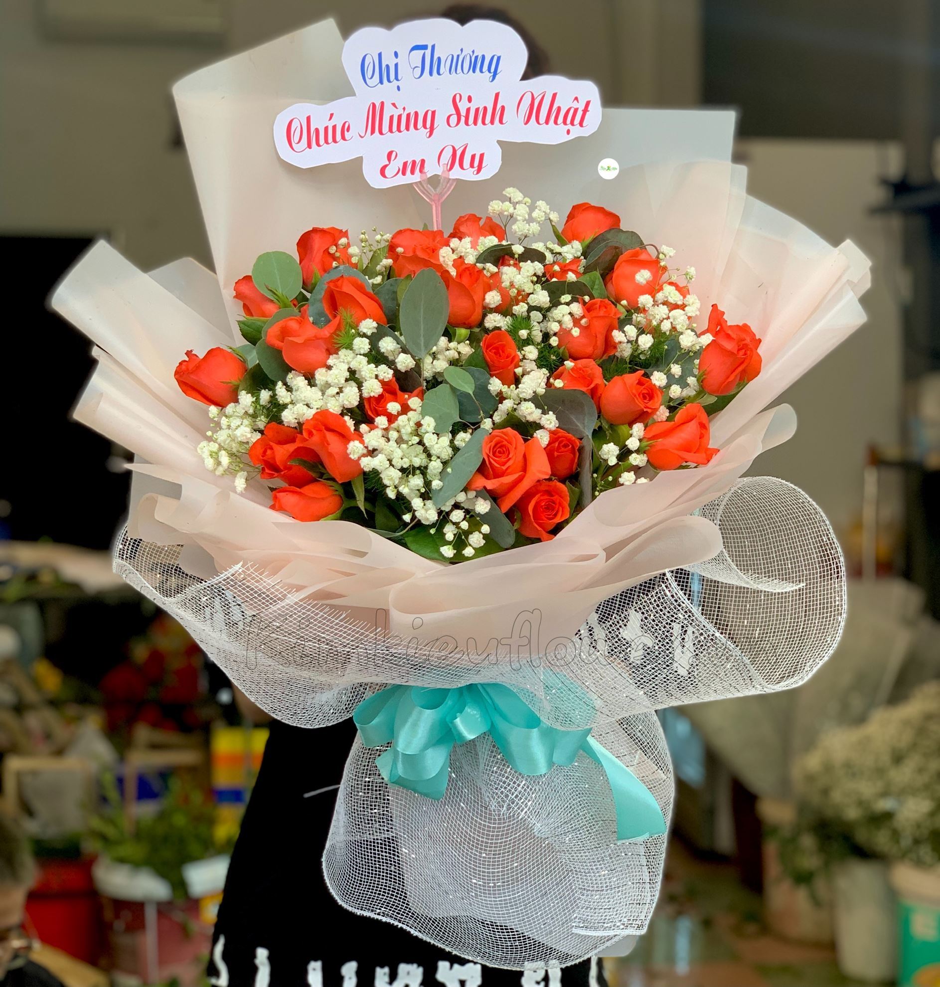Mẫu HB210 gồm các loại hoa: + 29 bông hồng đỏ cam + và các lá phụ khác- Liên hệ KIM KIỀU FLOWER để tư vấn thiết kế mẫu hoa theo yêu cầu bạn nhé!
