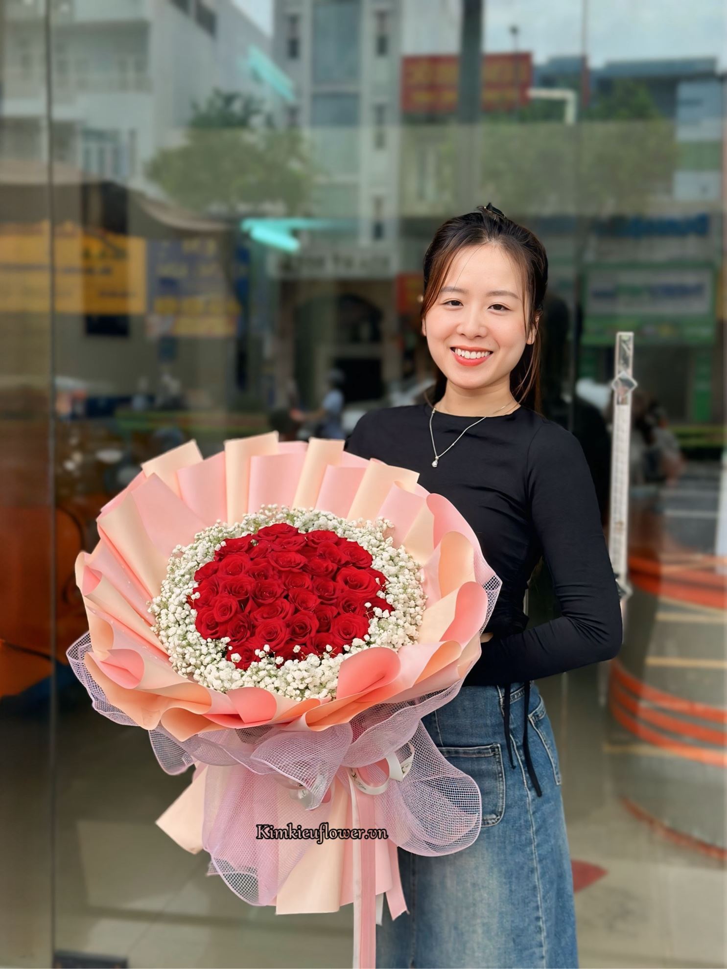 Mẫu HB784 gồm các loại hoa: + 34 hoa hồng đỏ + baby trắng + và các lá phụ khác - Liên hệ KIM KIỀU FLOWER để tư vấn thiết kế mẫu hoa theo yêu cầu bạn nhé!