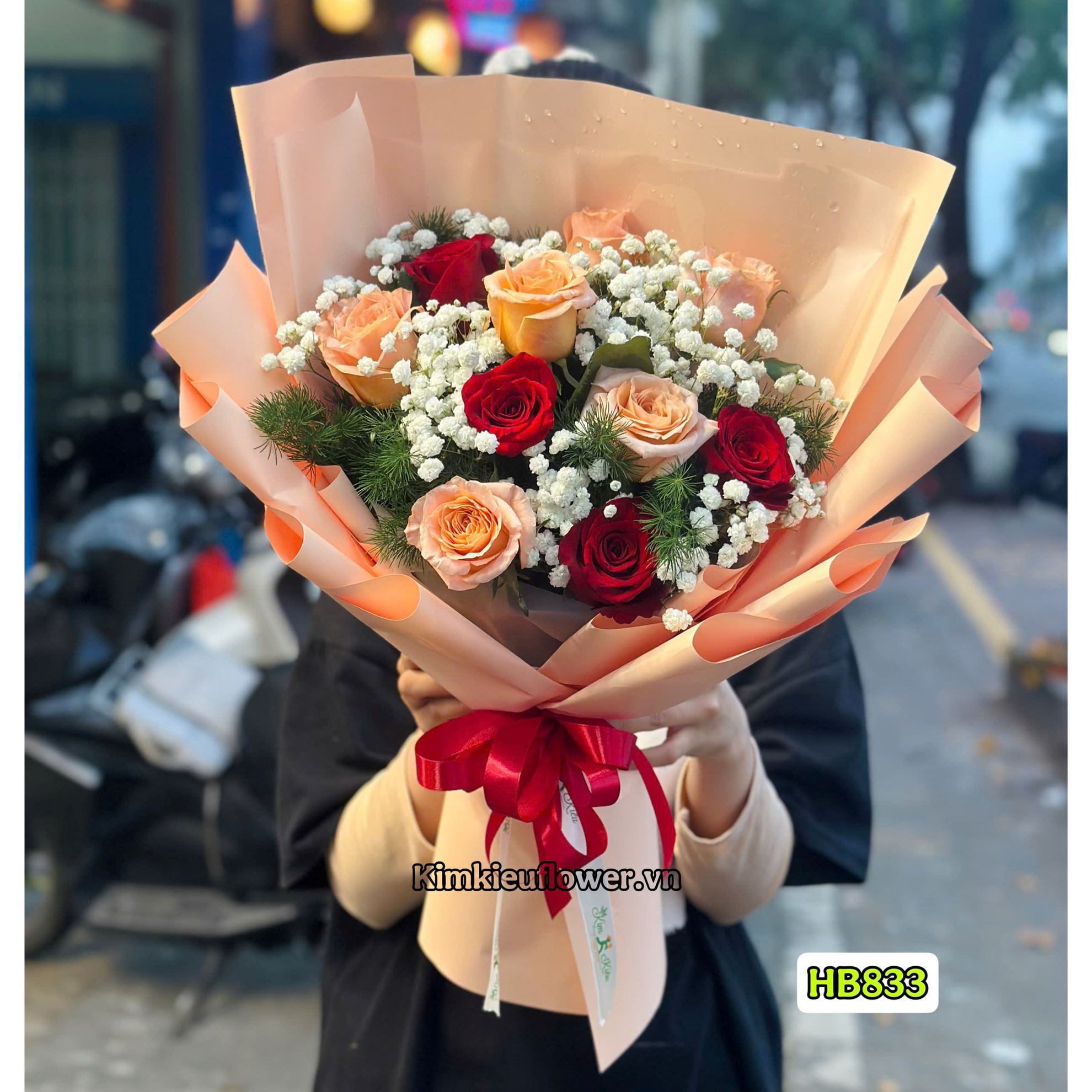 Mẫu HB833 gồm các loại hoa: + 4 hoa hồng đỏ eku + 6 hoa hồng shimmer + và các lá phụ khác - Liên hệ KIM KIỀU FLOWER để tư vấn thiết kế mẫu hoa theo yêu cầu bạn nhé!