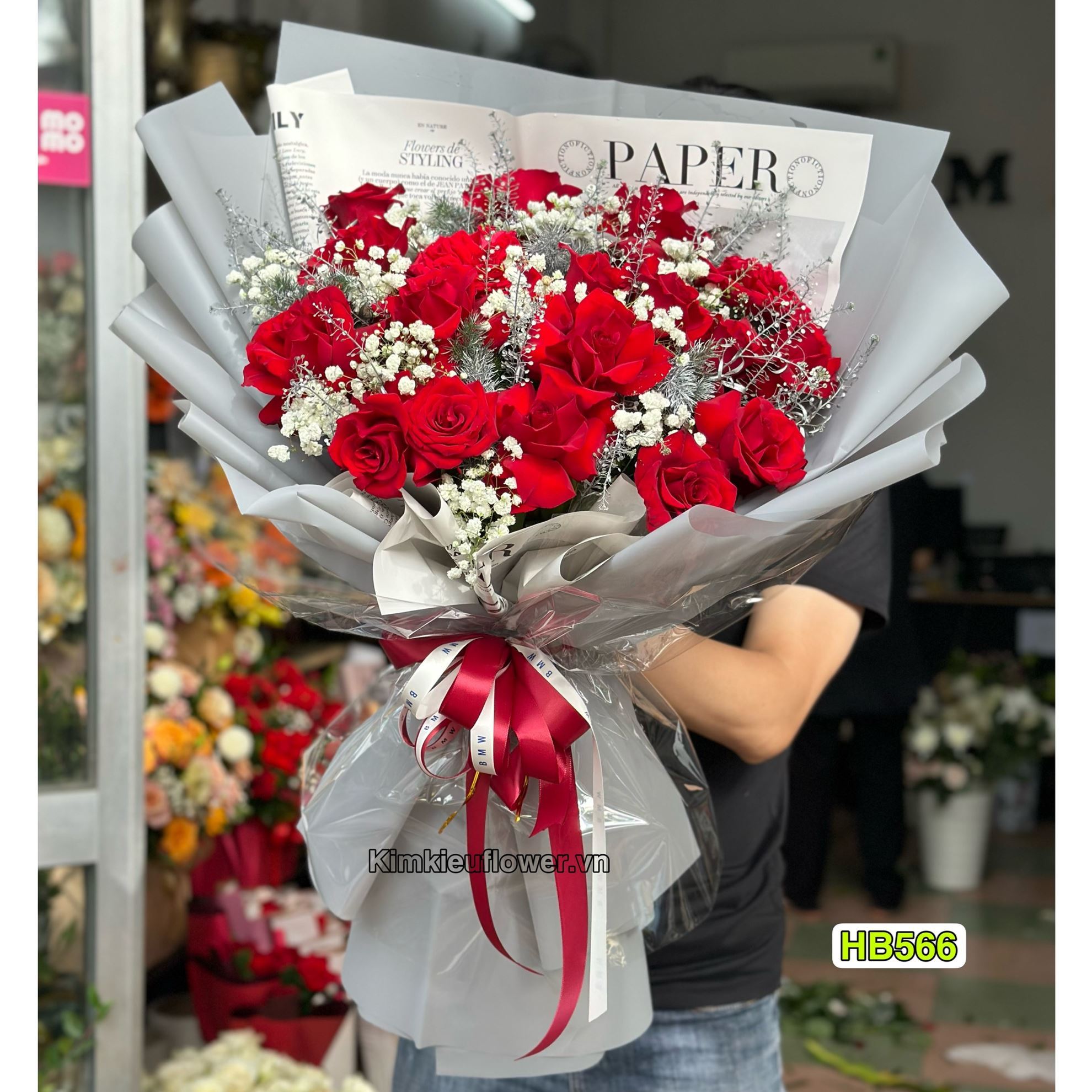 Bó hoa hồng đỏ - HB566 + 18 bông hồng đỏ + hoa và các phụ lá khác - Liên hệ KIM KIỀU FLOWER để tư vấn thiết kế mẫu hoa theo yêu cầu bạn nhé!