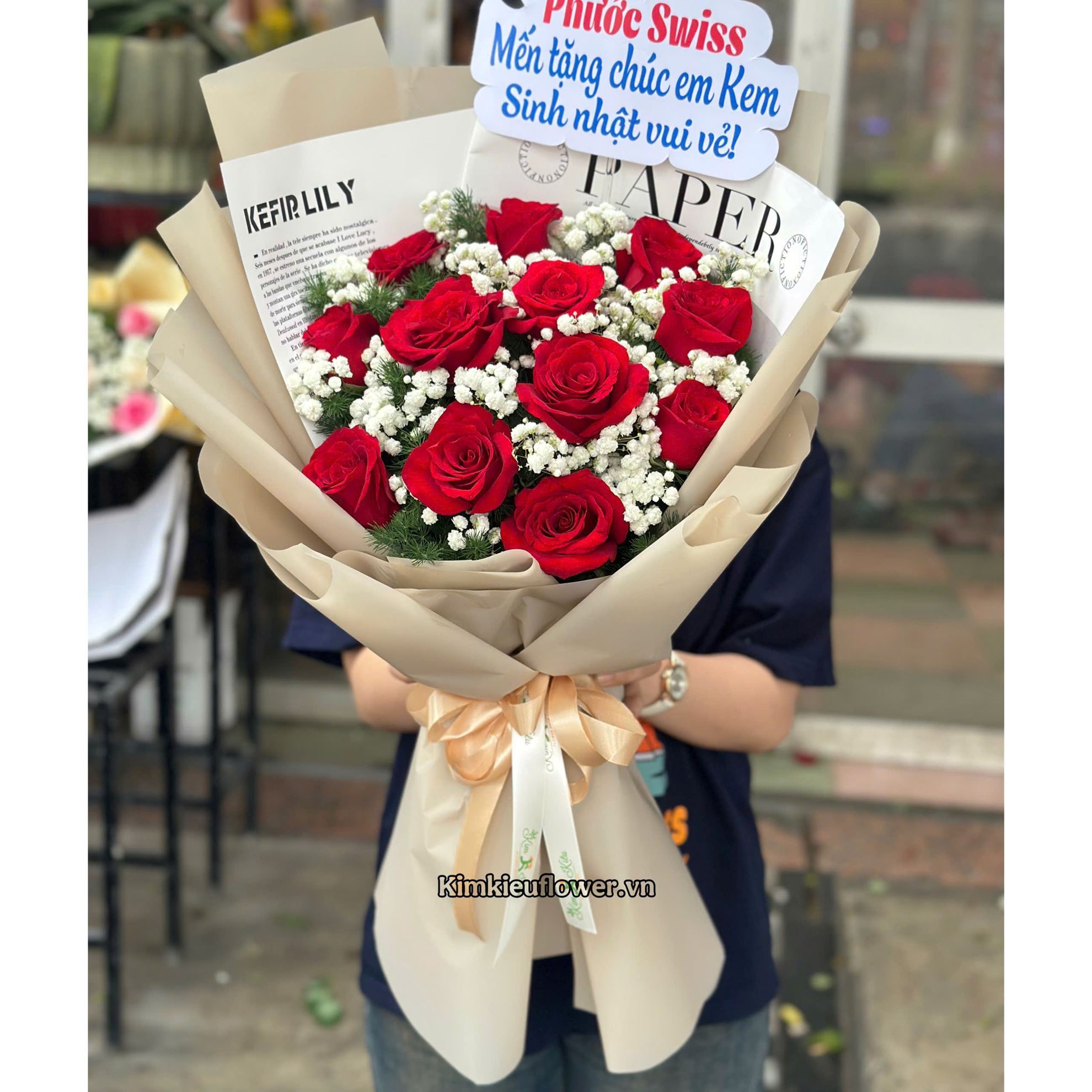 Mẫu HB854 gồm các loại hoa: + 12 hoa hồng đỏ + và các lá phụ khác - Liên hệ KIM KIỀU FLOWER để tư vấn thiết kế mẫu hoa theo yêu cầu bạn nhé!