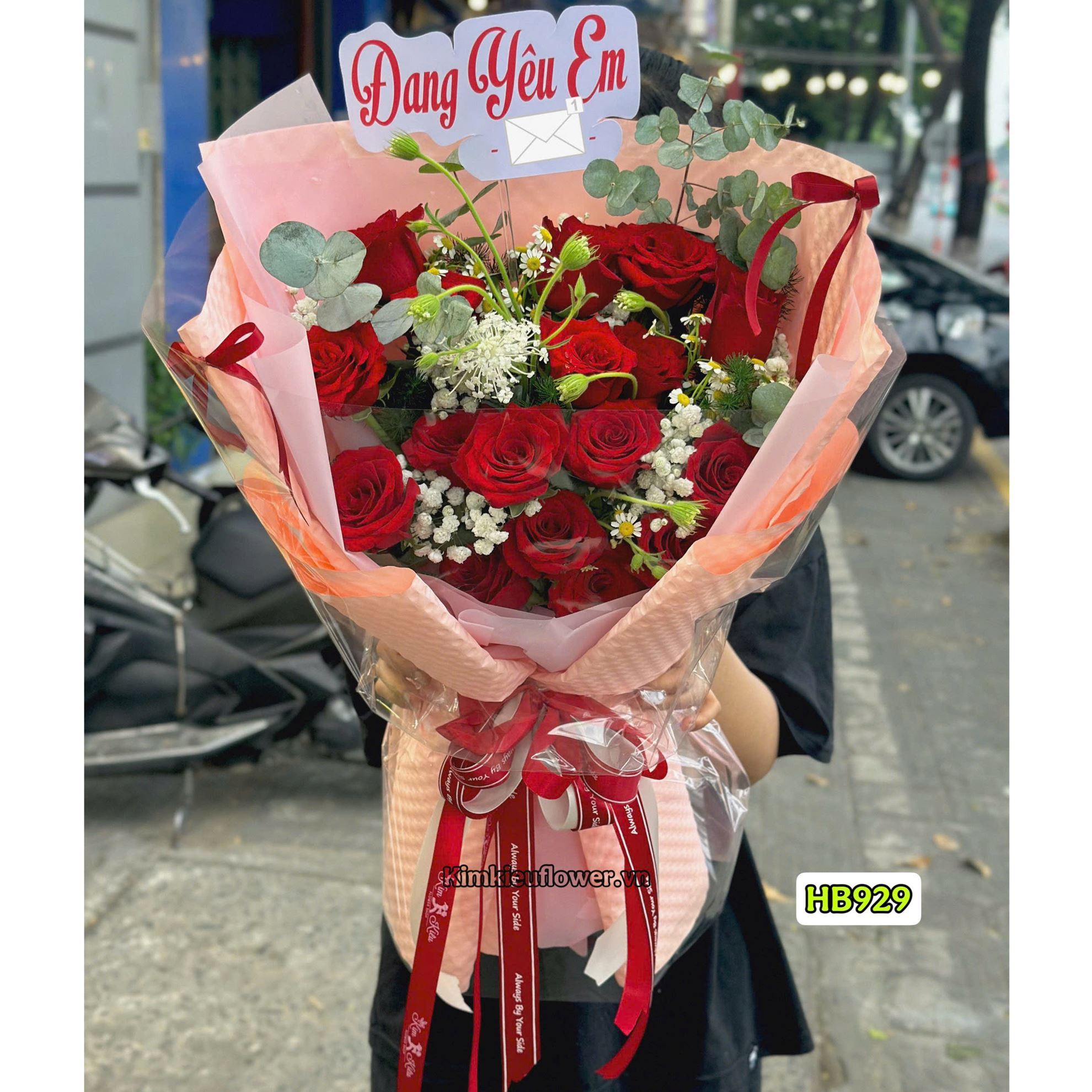 Mẫu HB929 gồm các loại hoa: + 17 hoa hồng đỏ eku + và các lá phụ khác - Liên hệ KIM KIỀU FLOWER để tư vấn thiết kế mẫu hoa theo yêu cầu bạn nhé!