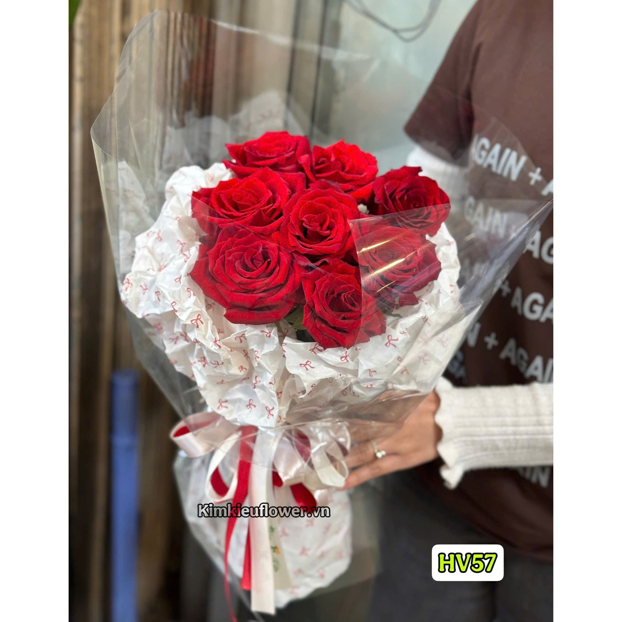 Mẫu HV55 gồm các loại hoa: + 8 hồng ĐỎ - và các hoa, lá phụ khác - Liên hệ KIM KIỀU FLOWER để tư vấn thiết kế mẫu hoa theo yêu cầu bạn nhé!