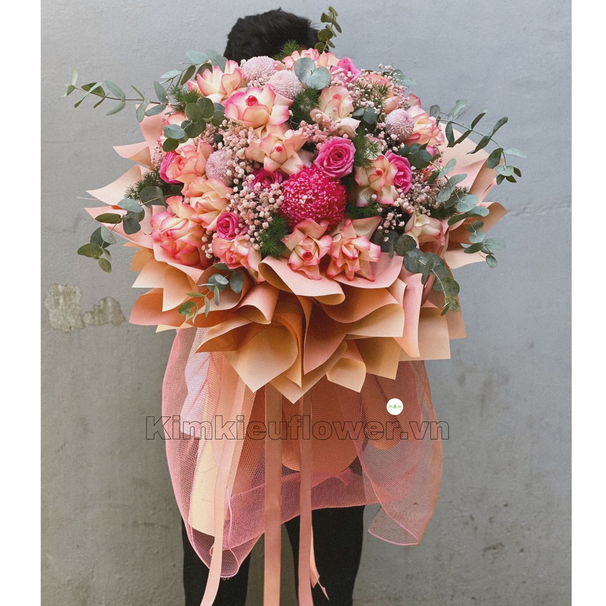 Mẫu HB347 Gồm các loại hoa : + hoa hồng dâu + hoa hồng kem + hoa hồng hỷ trứng + 1 cúc mẫu đơn hồng hàng nhập khẩu + cúc pingpong + và các lá phụ khác - Liên hệ KIM KIỀU FLOWER để tư vấn thiết kế mẫu hoa theo yêu cầu bạn nhé!