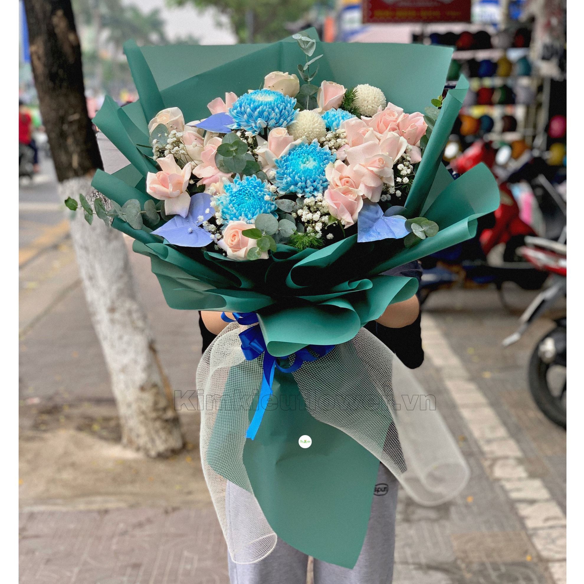Bó hoa hồng kem, cúc mẫu đơn xanh - HB297