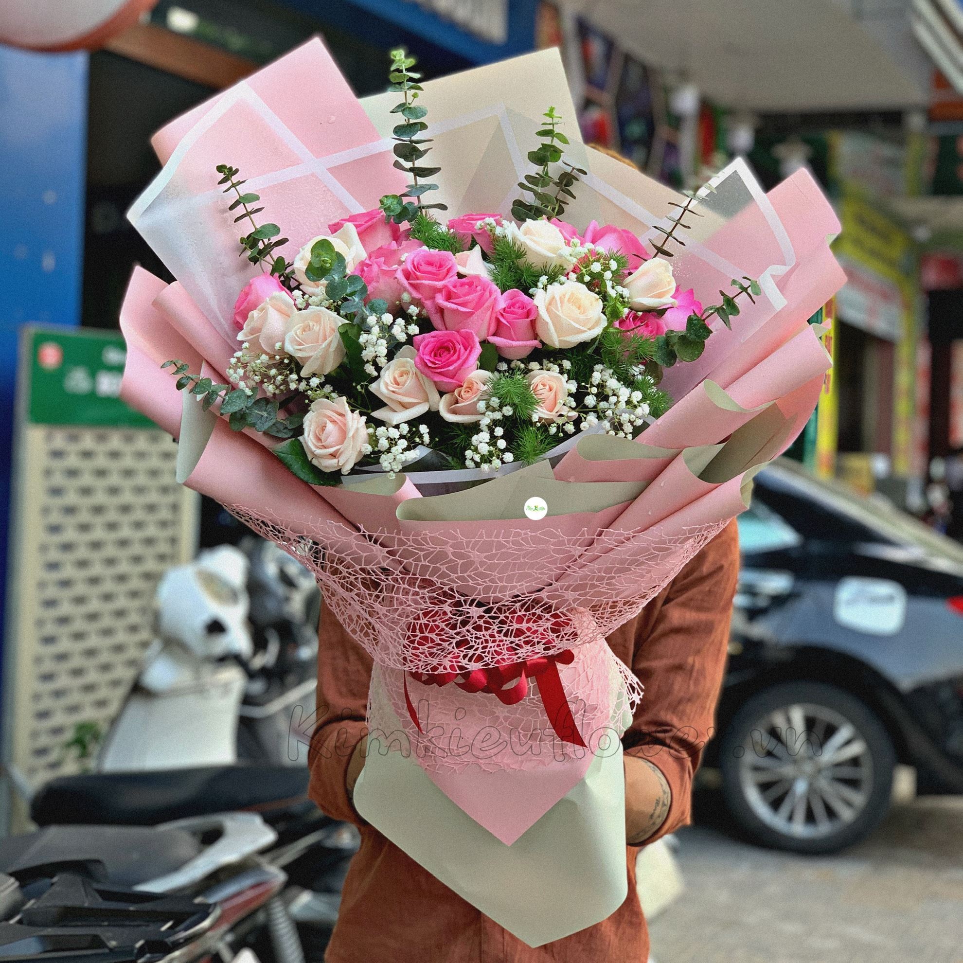 Mẫu HB191 gồm các loại : + 12 hồng kem + 15 hồng dâu + và các lá phụ khác- Liên hệ KIM KIỀU FLOWER để tư vấn thiết kế mẫu hoa theo yêu cầu bạn nhé!
