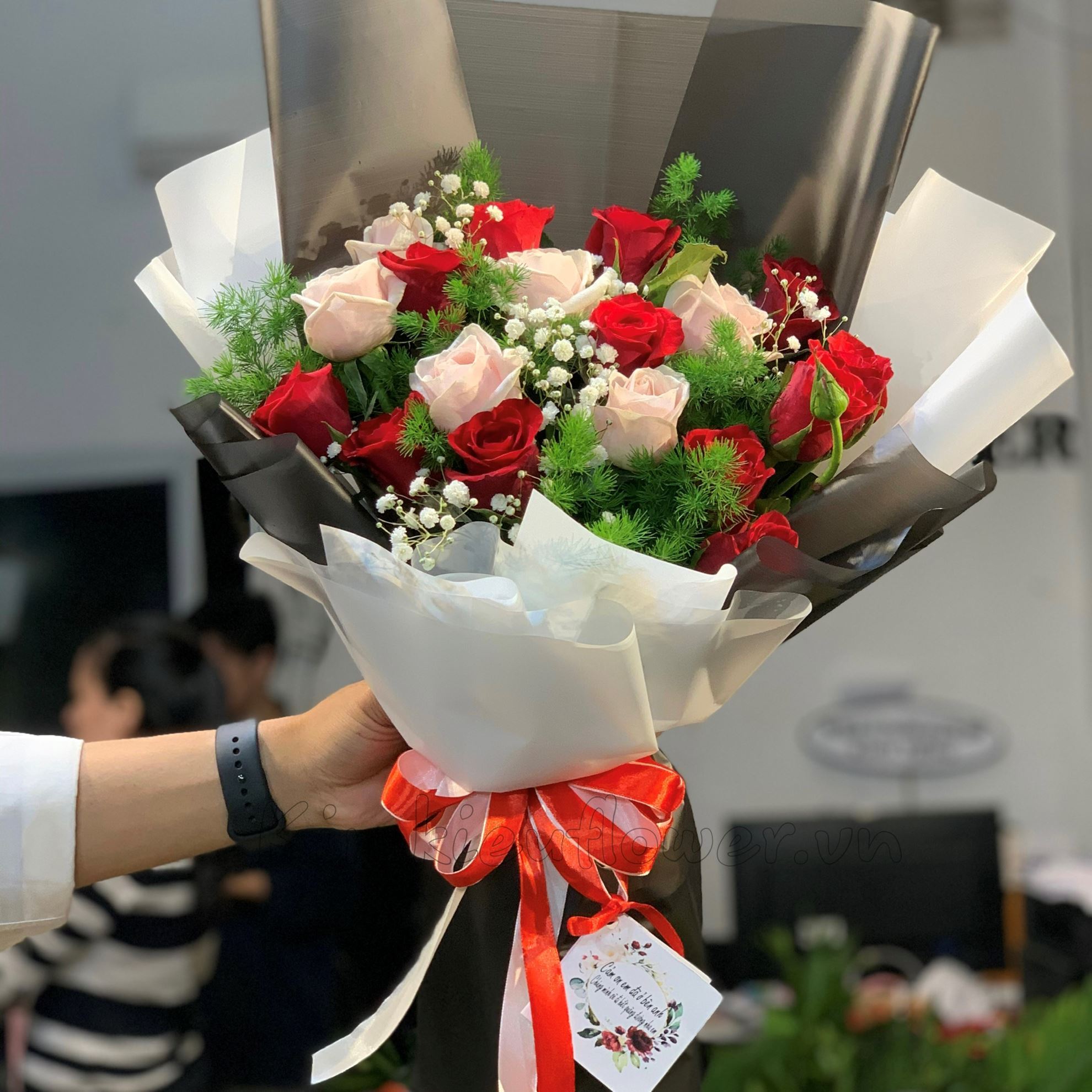 Mẫu HB127 gồm các loại hoa: + 9 hoa hồng đỏ + 9 hoa hồng kem + hoa và lá phụ khác -Liên hệ KIM KIỀU FLOWER để tư vấn thiết kế mẫu hoa theo yêu cầu bạn nhé!