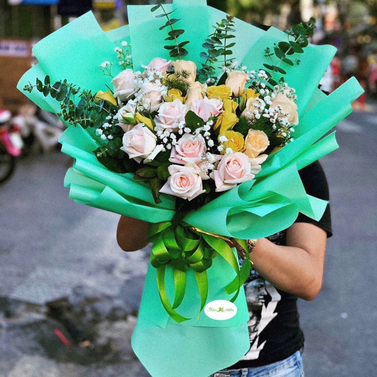 Mẫu HB84 gồm các loại hoa: + 10 hoa hồng kem + 9 hoa hồng vàng + 6 hoa hồng mỡ gà + và các hoa, lá phụ khác- Liên hệ KIM KIỀU FLOWER để tư vấn thiết kế mẫu hoa theo yêu cầu bạn nhé!