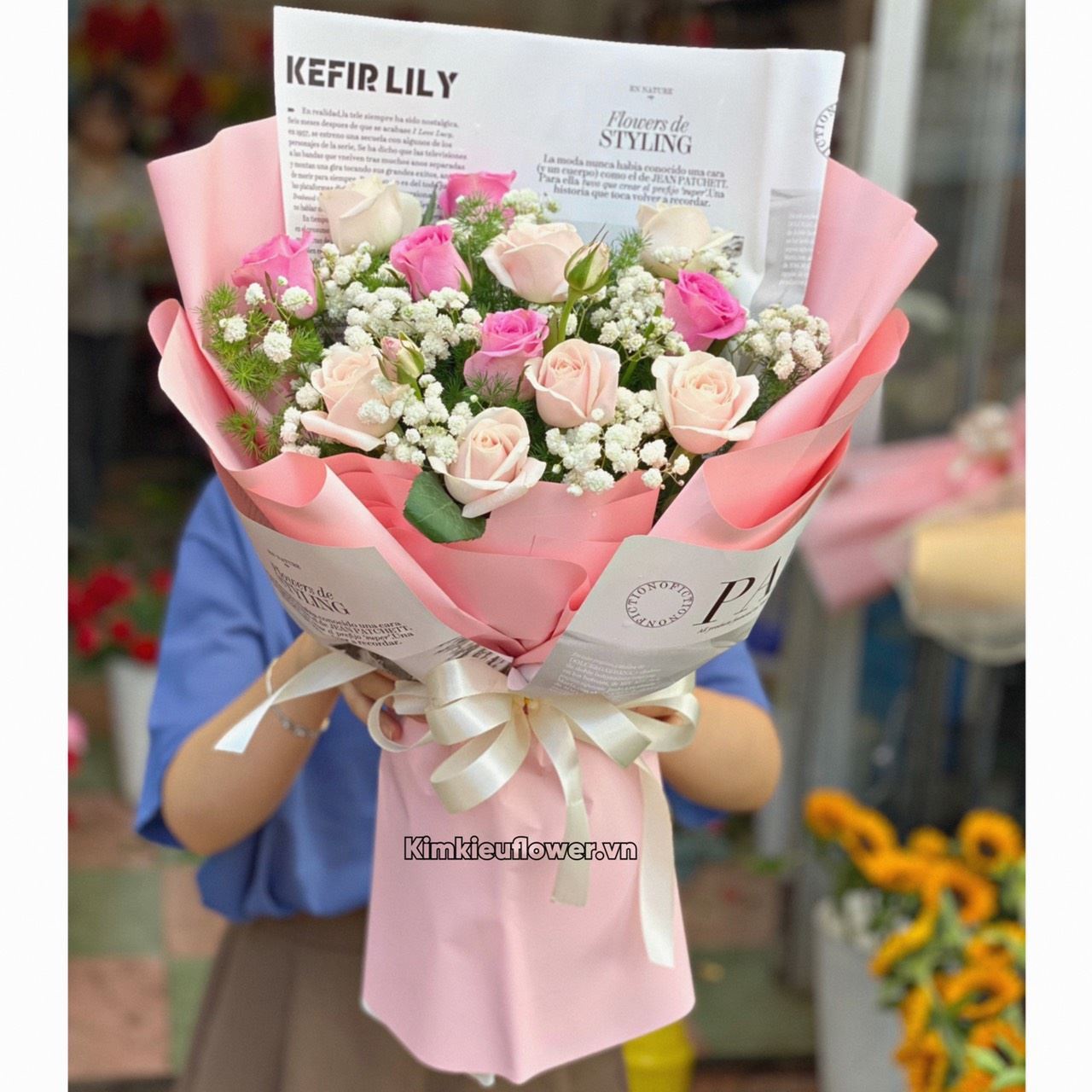 Mẫu HB481 gồm các loại hoa + 7 hoa hồng kem + 5 hoa hồng sen nhí + và các lá phụ khác - Liên hệ KIM KIỀU FLOWER để tư vấn thiết kế mẫu hoa theo yêu cầu bạn nhé!
