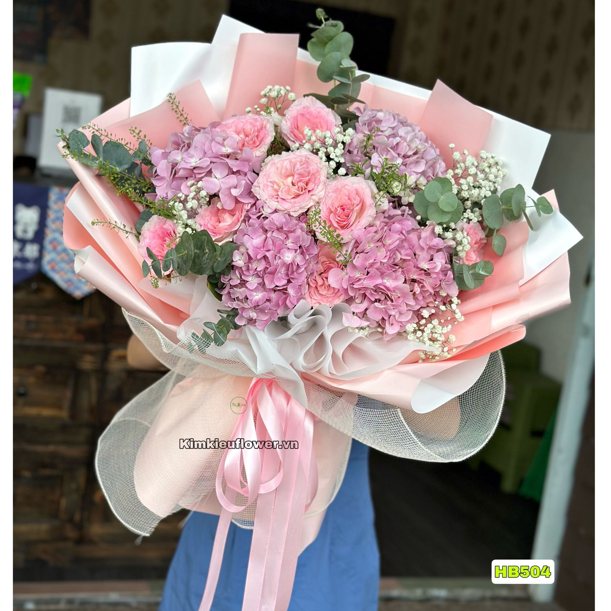 Mẫu HB504 gồm các loại hoa : + hoa hồng lạc thần + cẩm tú cầu hồng nhập khẩu + và các lá phụ khác - Liên hệ KIM KIỀU FLOWER để tư vấn thiết kế mẫu hoa theo yêu cầu bạn nhé!