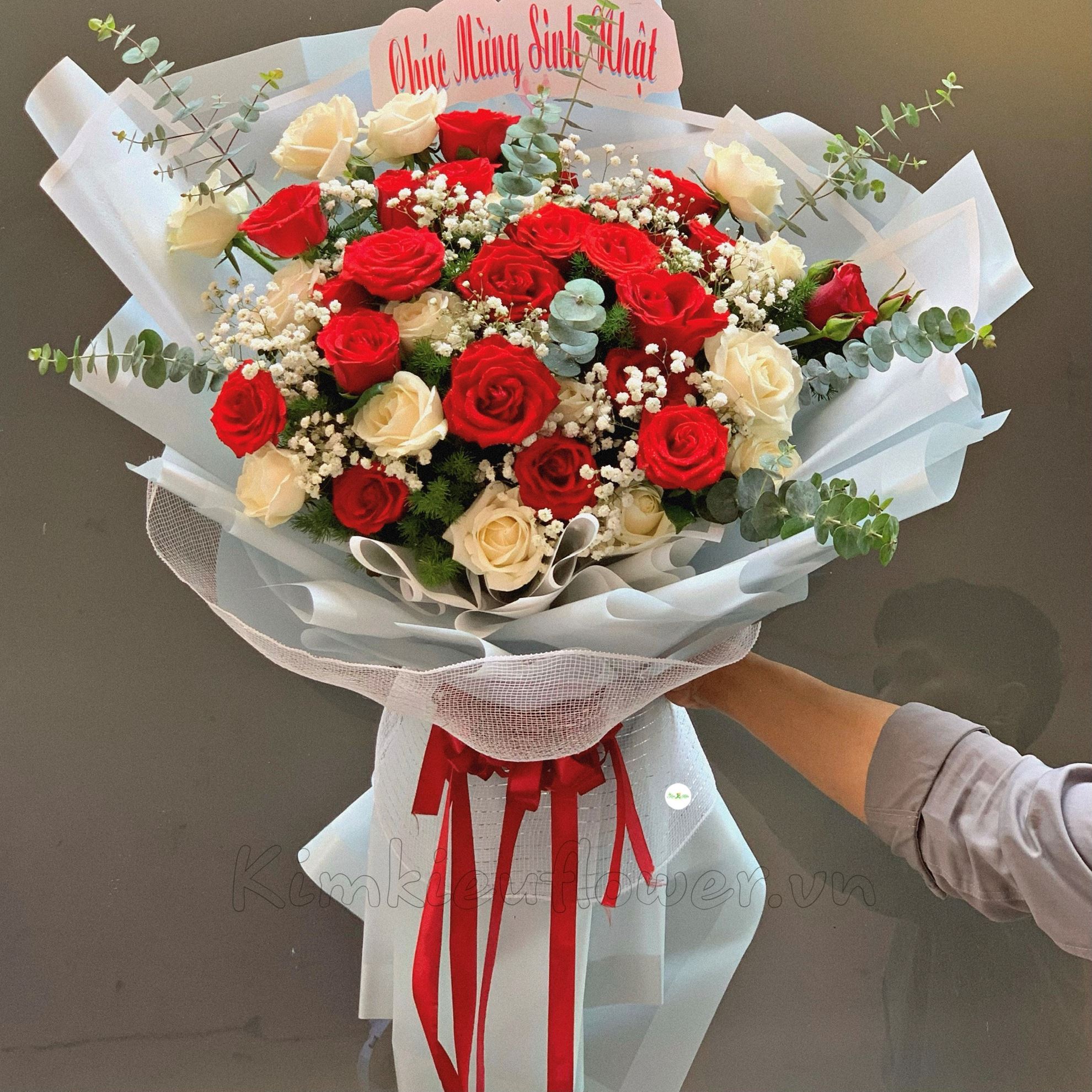 Mẫu HB193 gồm các loại hoa: + 25 hoa hồng đỏ + 20 hoa hồng trắng + và các lá phụ khác- Liên hệ KIM KIỀU FLOWER để tư vấn thiết kế mẫu hoa theo yêu cầu bạn nhé!