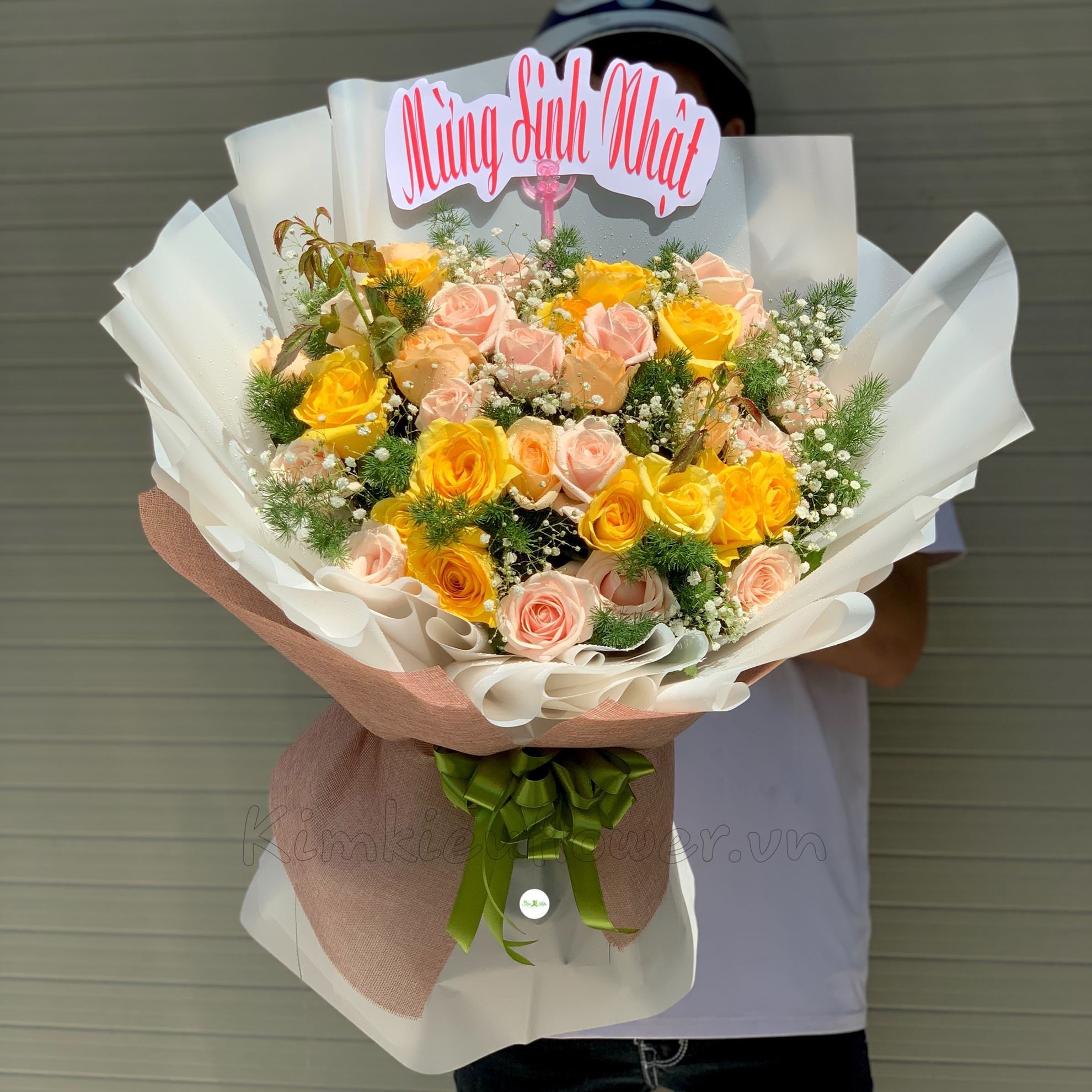 Mẫu HB234 gồm các loại hoa: + 14 hoa hồng vàng + 18 hoa hồng kem, hồng mỡ gà + và các hoa,lá phụ khác - Liên hệ KIM KIỀU FLOWER để tư vấn thiết kế mẫu hoa theo yêu cầu bạn nhé!