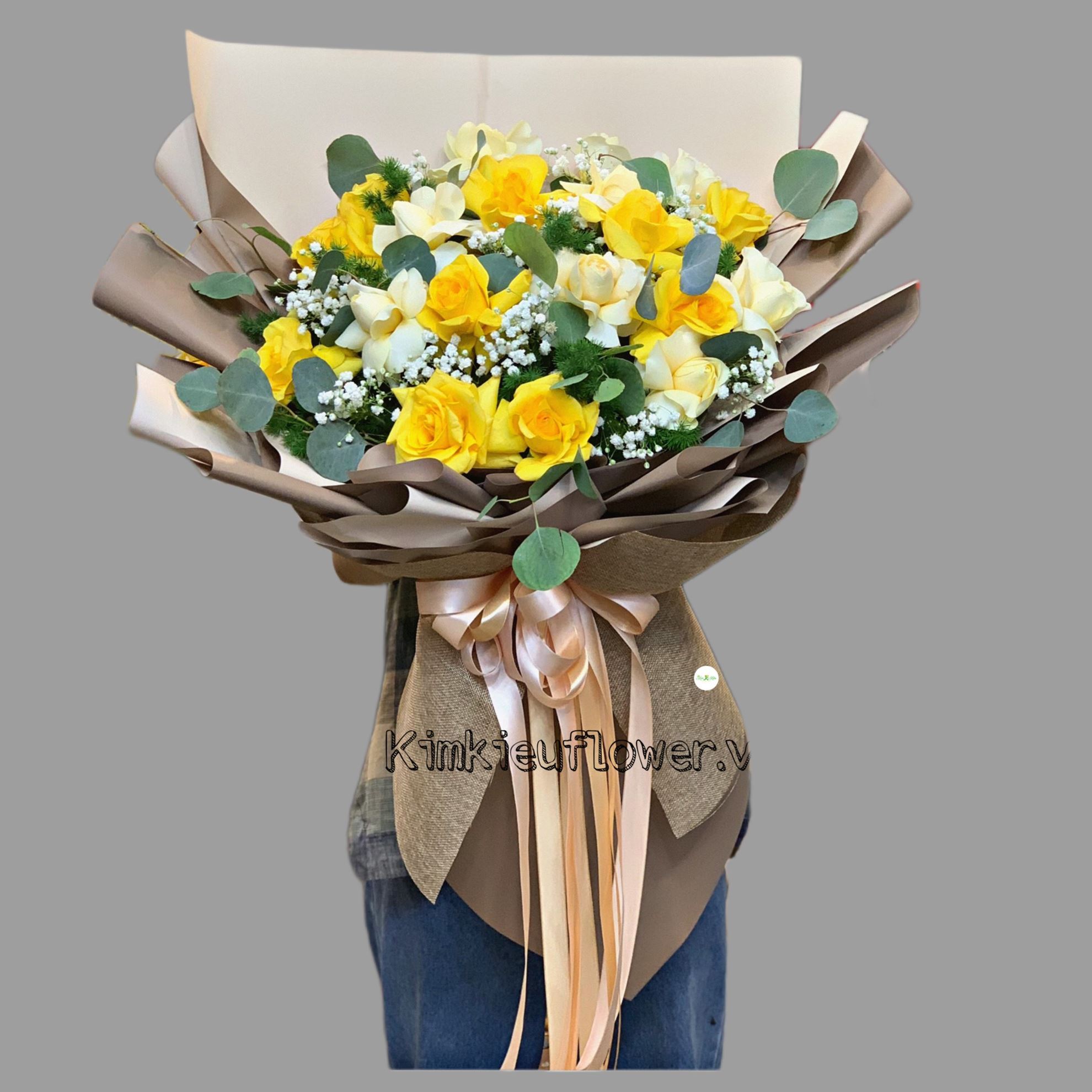 Mẫu HB358 gồm các loại hoa: + 10 victor vàng + 9 hoa hồng vàng và các lá phụ khác - Liên hệ KIM KIỀU FLOWER để tư vấn thiết kế mẫu hoa theo yêu cầu bạn nhé!