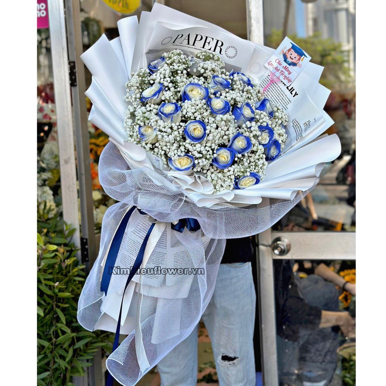 Mẫu HB467 gồm các loại hoa: + 19 hoa hồng xanh dương xịt màu + baby trắng + và các lá phụ khác - Liên hệ KIM KIỀU FLOWER để tư vấn thiết kế mẫu hoa theo yêu cầu bạn nhé!