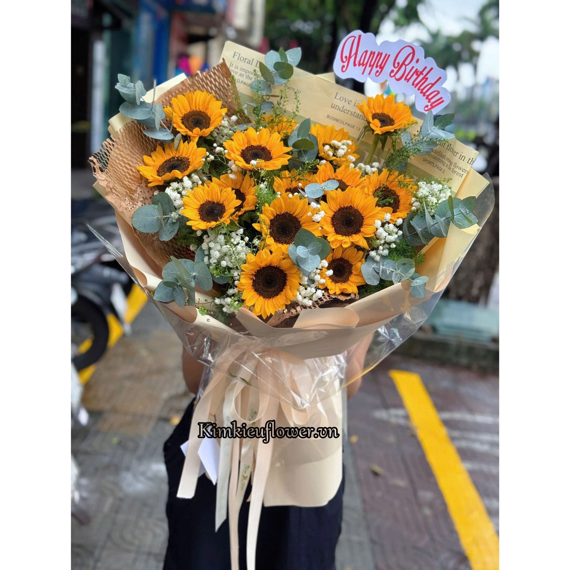 Mẫu HB759 gồm các loại hoa: + 15 hoa hướng dương + và các lá phụ khác - Liên hệ KIM KIỀU FLOWER để tư vấn thiết kế mẫu hoa theo yêu cầu bạn nhé!