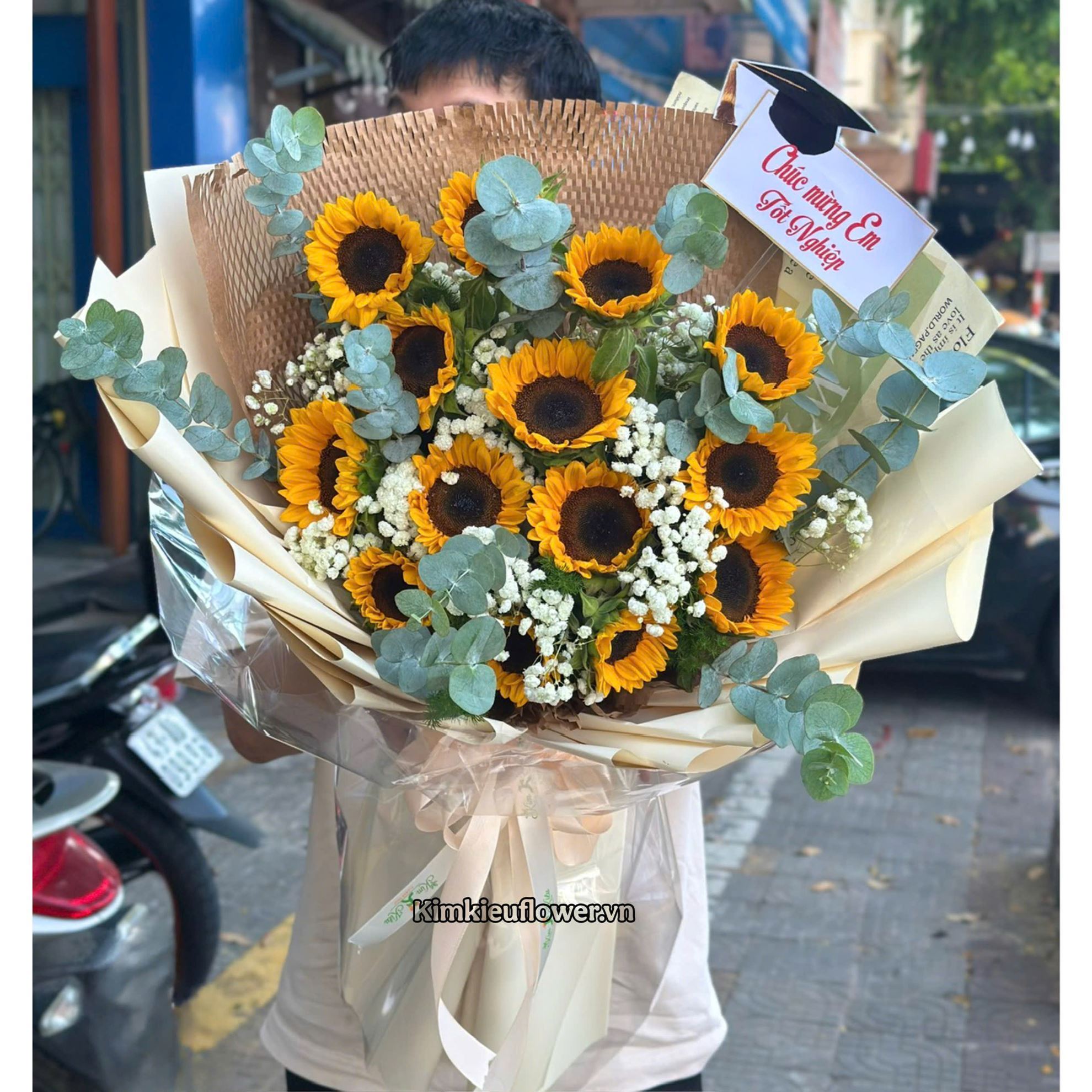 Mẫu PN37 gồm các loại hoa: + 14 hướng dương + và các lá phụ khác - Liên hệ KIM KIỀU FLOWER để tư vấn thiết kế mẫu hoa theo yêu cầu bạn nhé!