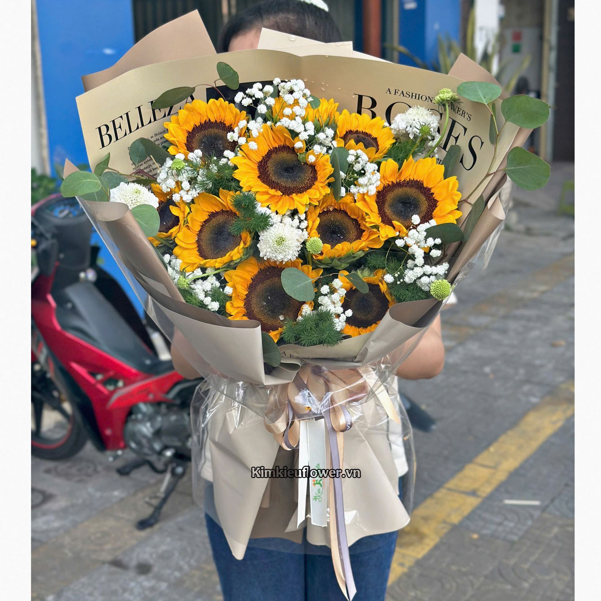 Mẫu PN83 gồm các loại hoa: + 10 hoa hướng dương + scabiosa trắng + và các lá phụ khác - Liên hệ KIM KIỀU FLOWER để tư vấn thiết kế mẫu hoa theo yêu cầu bạn nhé!