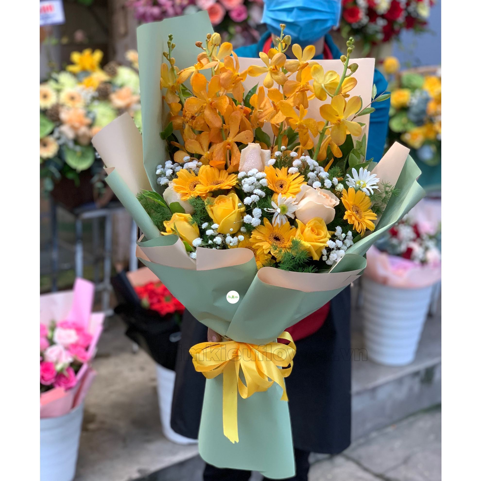 Mẫu BH01 gồm các loại hoa: + hoa hồng vàng + hoa hồng mỡ gà + đồng tiền nhí + lan vàng + và các lá phụ khác- Liên hệ KIM KIỀU FLOWER để tư vấn thiết kế mẫu hoa theo yêu cầu bạn nhé!