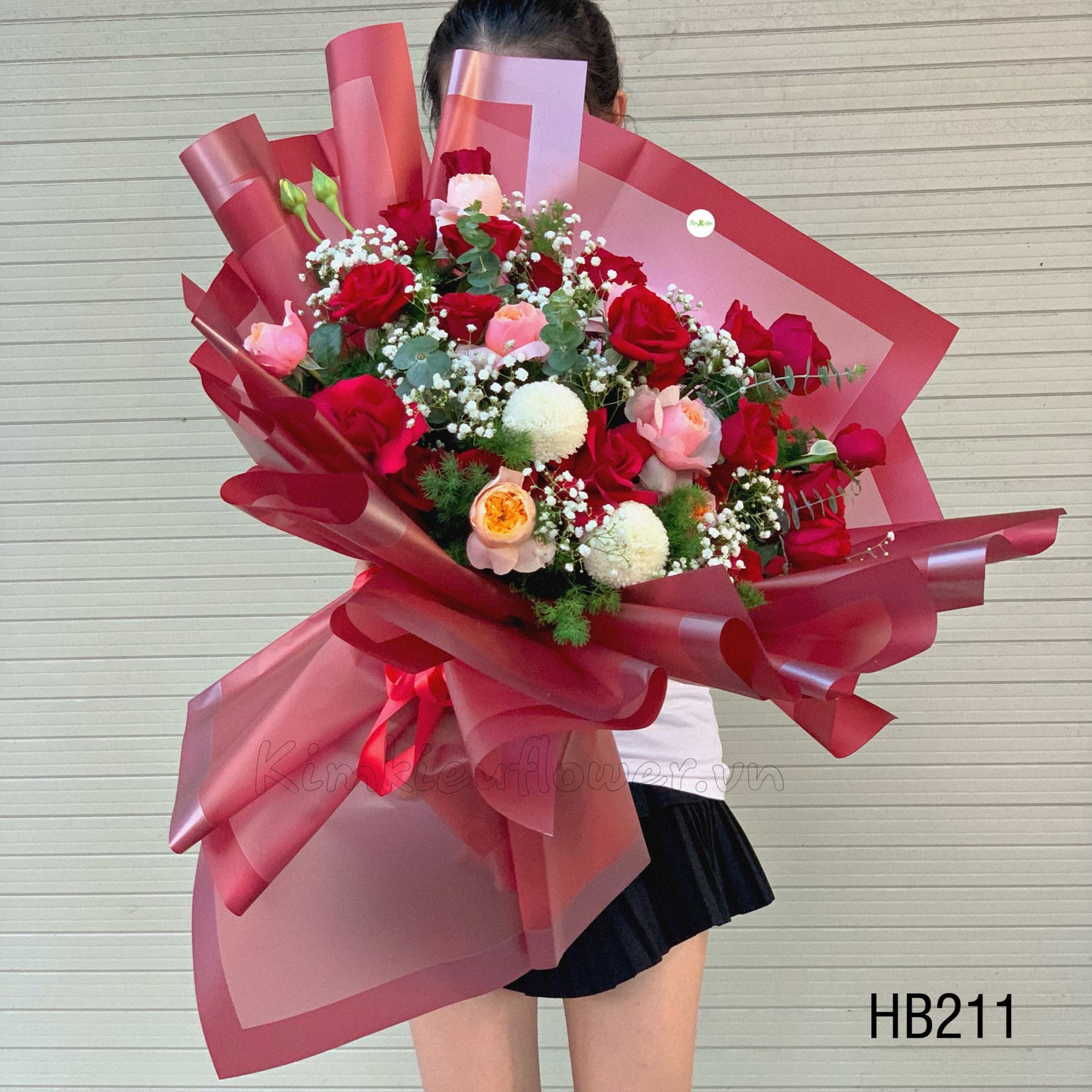 Mẫu HB211 gồm các loại hoa: + pingpong trắng + 19 hoa hồng đỏ + 7 hồng juliet + và các lá phụ khác- Liên hệ KIM KIỀU FLOWER để tư vấn thiết kế mẫu hoa theo yêu cầu bạn nhé!
