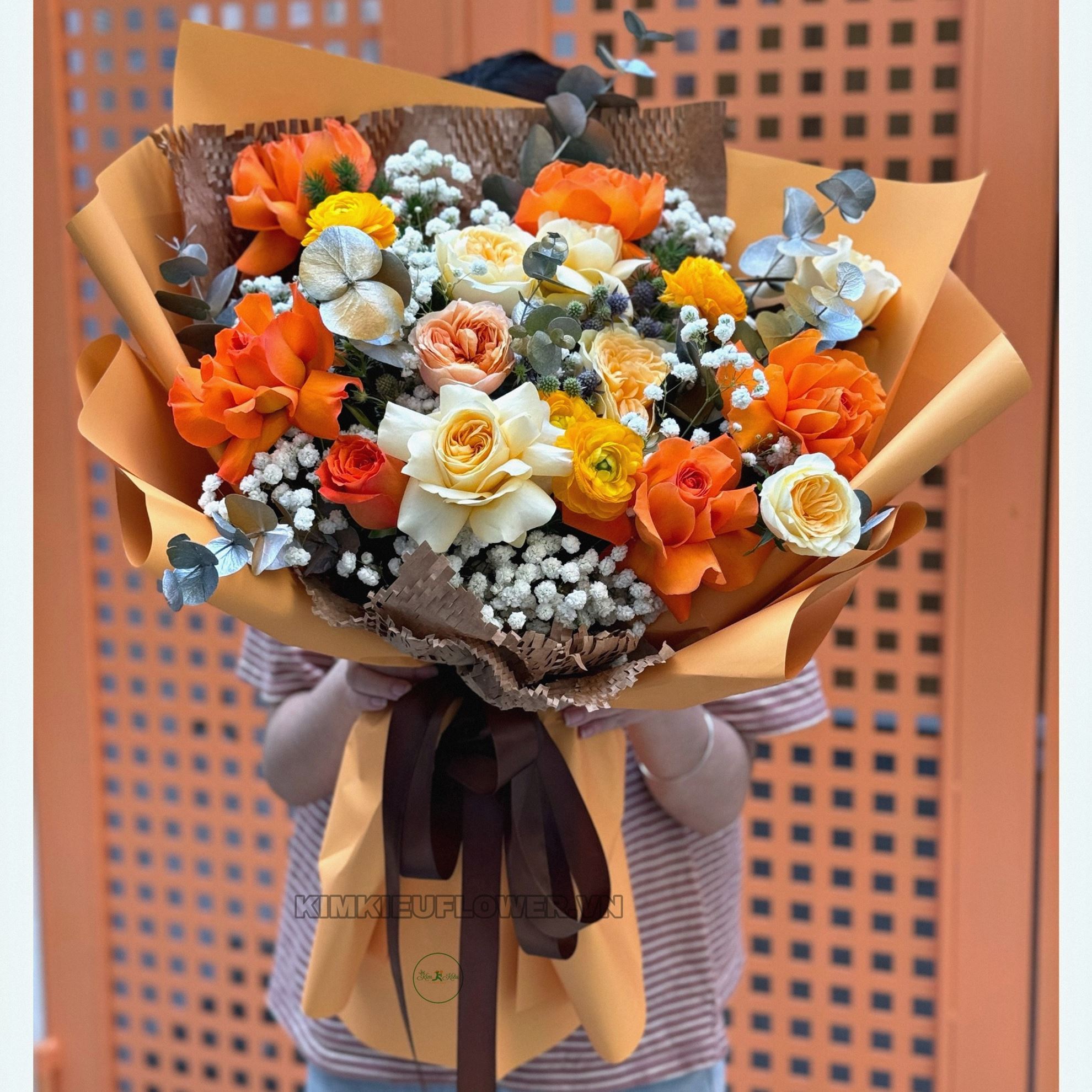 Bó hoa HB622 gồm: + 6 Hoa hồng cam + 4 Mao lương cam + 6 Hoa hồng victor vàng + và các lá phụ khác - Liên hệ KIM KIỀU FLOWER để tư vấn thiết kế mẫu hoa theo yêu cầu bạn nhé!