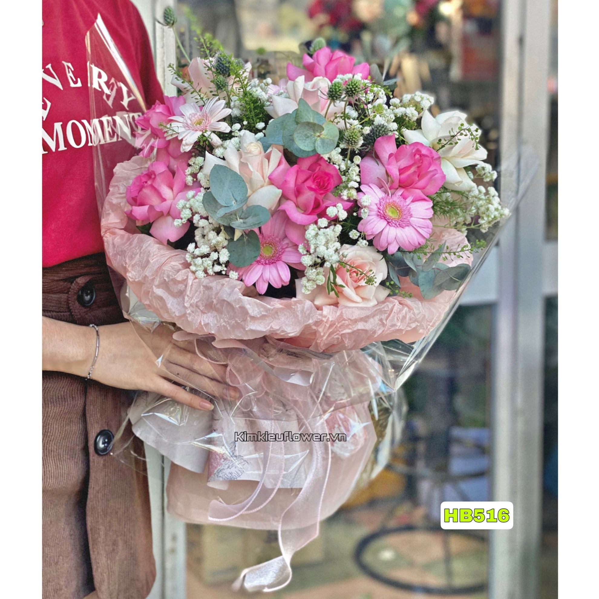 Mẫu HB516 gồm các loại hoa: + 5 hoa hồng dâu + 5 hoa hồng kem + 5 đồng tiền nhí + và các hoa,lá phụ khác - Liên hệ KIM KIỀU FLOWER để tư vấn thiết kế mẫu hoa theo yêu cầu bạn nhé!