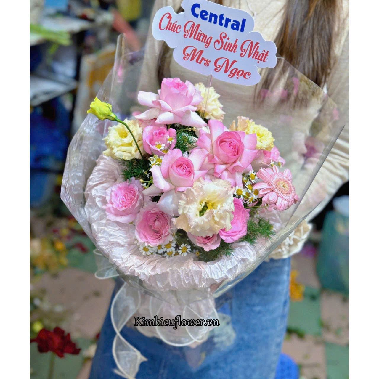 Mẫu HB779 gồm các loại hoa: + 10 hồng lạc thần + cát tường xoăn + đồng tiền hồng + và các lá phụ khác - Liên hệ KIM KIỀU FLOWER để tư vấn thiết kế mẫu hoa theo yêu cầu bạn nhé!