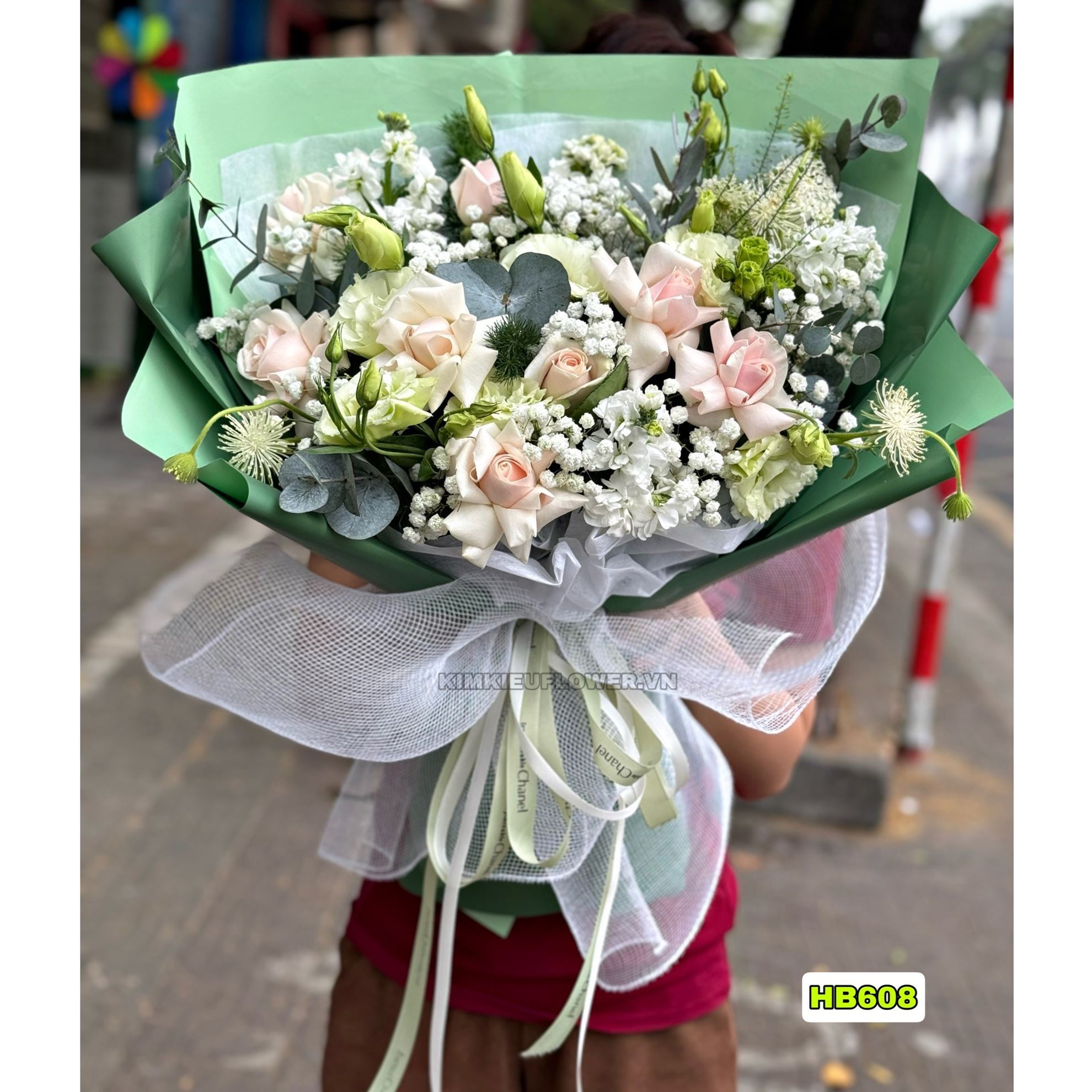 Bó hoa HB608 gồm: + 4 hoa phi yến + 8 Hoa hồng kem + Cát tường xanh + và các lá phụ khác - Liên hệ KIM KIỀU FLOWER để tư vấn thiết kế mẫu hoa theo yêu cầu bạn nhé!