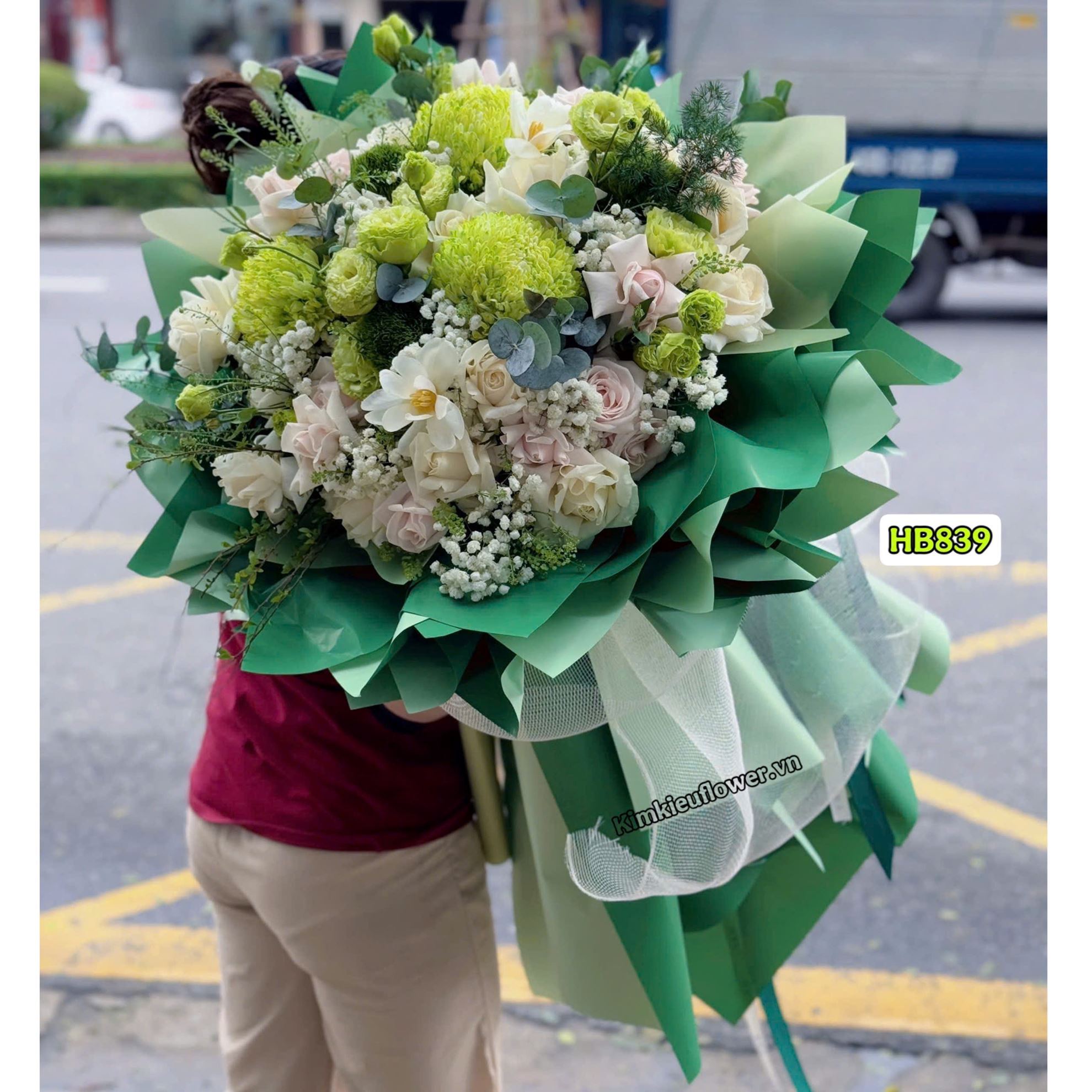 Mẫu HB839 gồm các loại hoa: + hoa tulip trắng + cúc mẫu đơn xanh lá + hoa hồng kem + cát tường xanh xoắn + hoa hồng trắng + và các lá phụ khác - Liên hệ KIM KIỀU FLOWER để tư vấn thiết kế mẫu hoa theo yêu cầu bạn nhé!