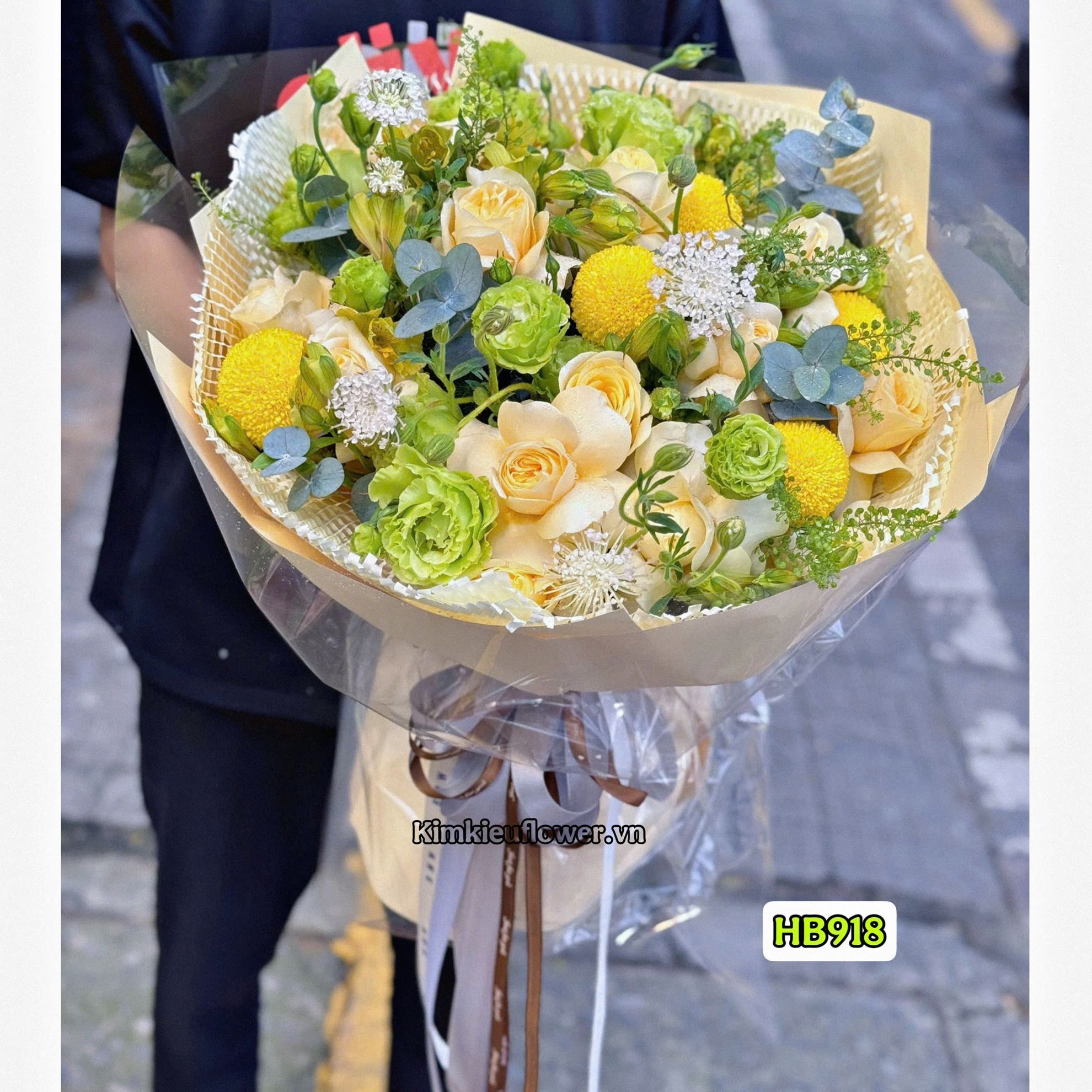 Mẫu HB918 gồm các loại hoa: + 5 cúc pingpong vàng + 13 victo vàng + thuỷ tiên vàng + cát tường xanh + và các lá phụ khác - Liên hệ KIM KIỀU FLOWER để tư vấn thiết kế mẫu hoa theo yêu cầu bạn nhé!