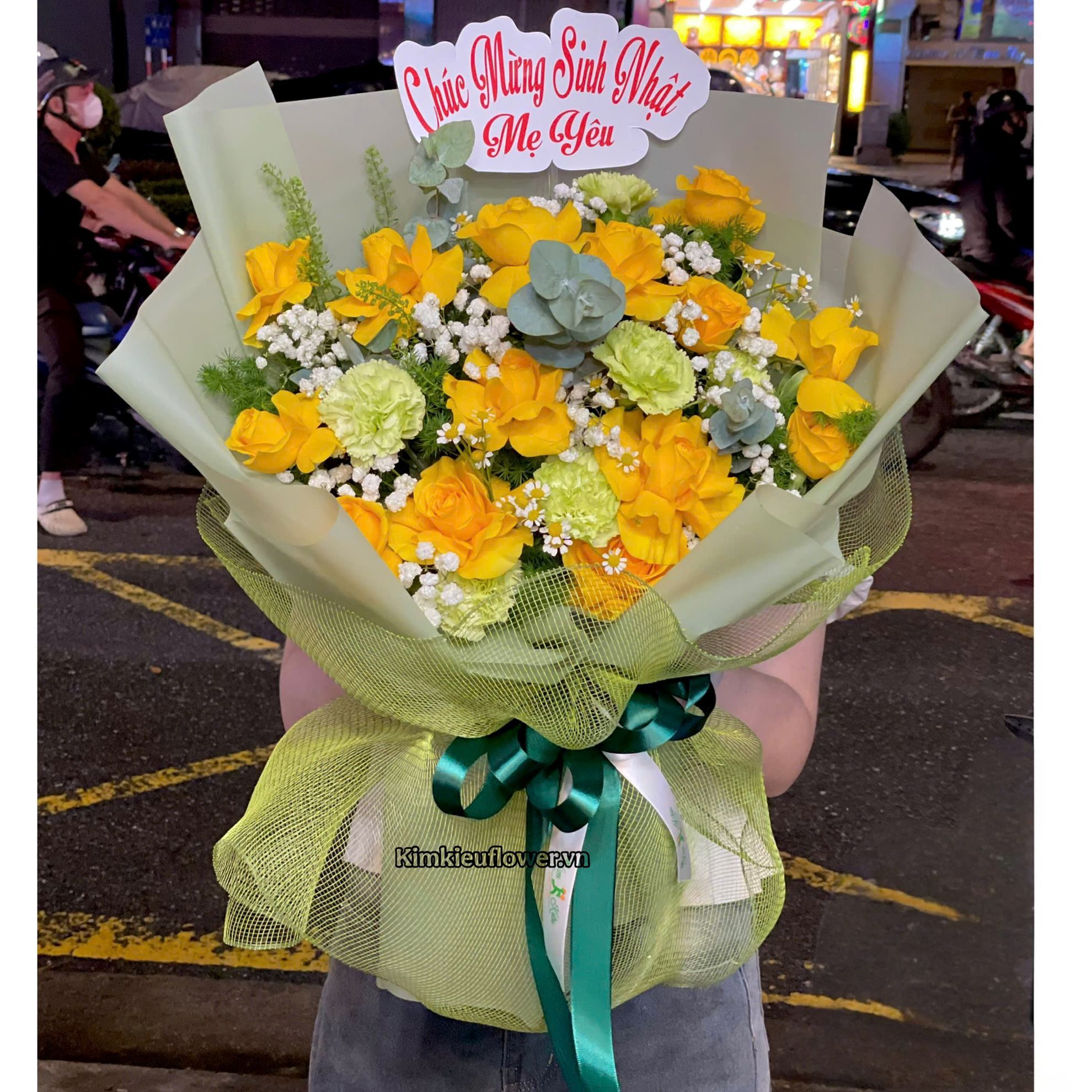 Mẫu PN79 gồm các loại hoa: + 14 vàng helen + 6 cẩm chướng xanh + và các lá phụ khác - Liên hệ KIM KIỀU FLOWER để tư vấn thiết kế mẫu hoa theo yêu cầu bạn nhé!