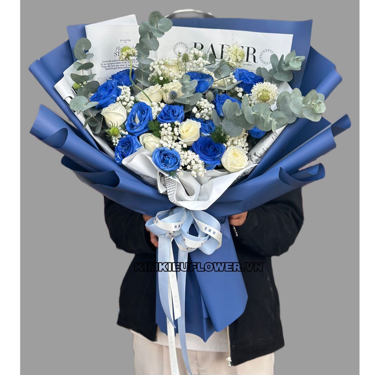 Bó hoa HB701 gồm: + 9 hoa hồng trắng + 12 hoa hồng trắng xịt xanh + và các lá phụ khác - Liên hệ KIM KIỀU FLOWER để tư vấn thiết kế mẫu hoa theo yêu cầu bạn nhé!