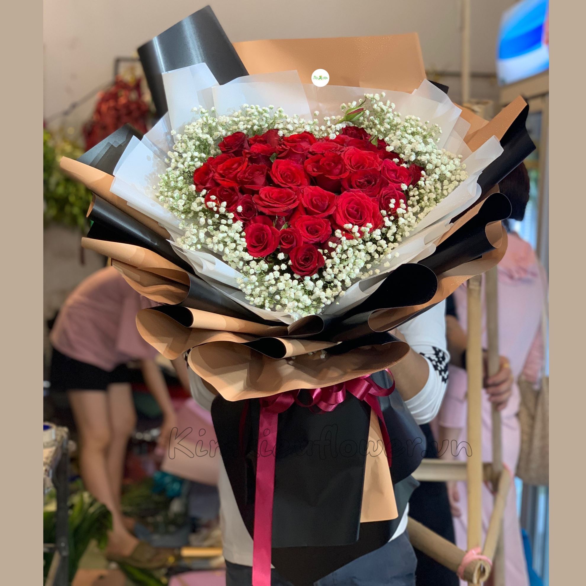 Mẫu HB243 gồm các loại hoa: + hoa hồng đỏ + baby trắng Hà Lan nhập khẩu + và các lá phụ khác - Liên hệ KIM KIỀU FLOWER để tư vấn thiết kế mẫu hoa theo yêu cầu bạn nhé!