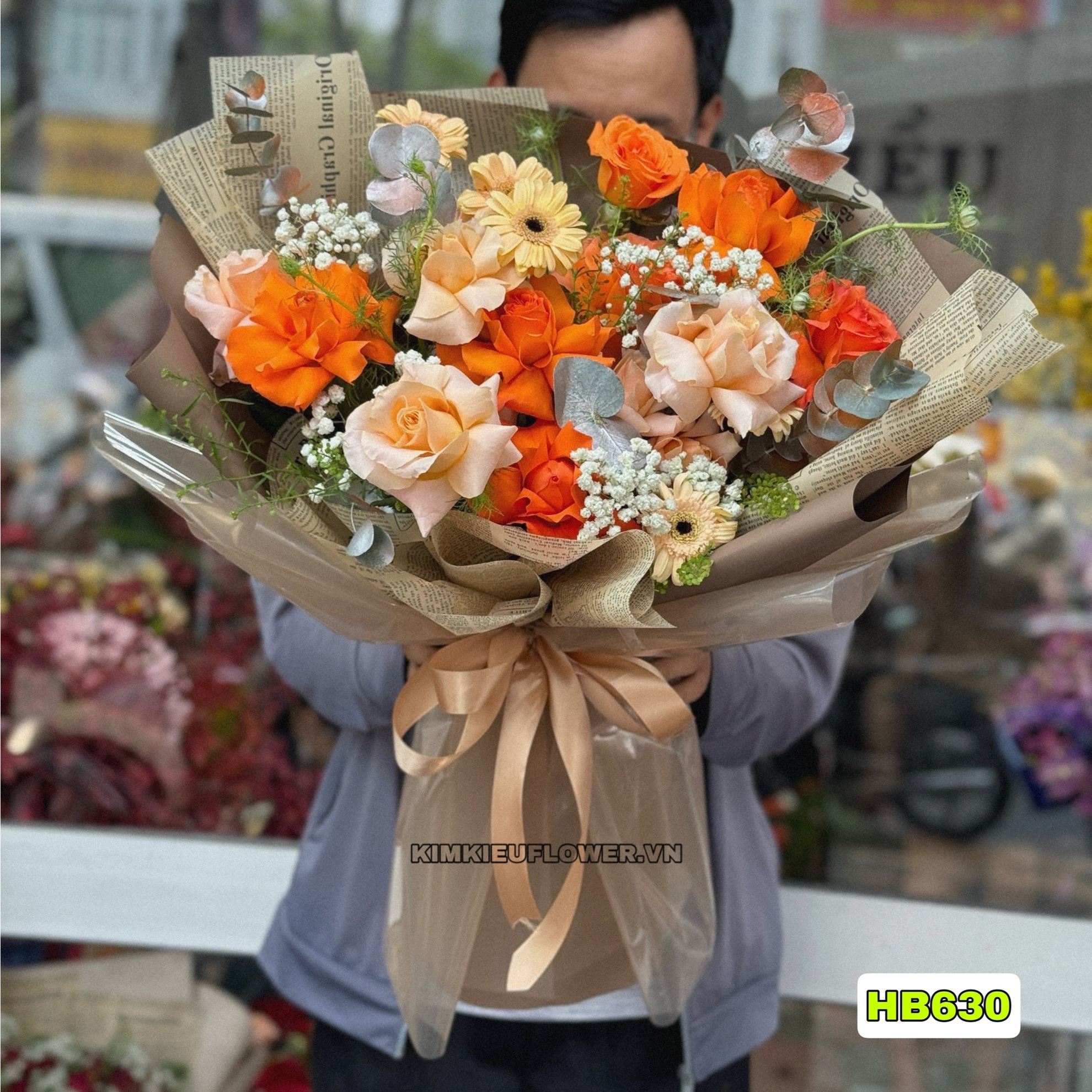 Bó hoa HB630 gồm: + 7 Hoa hồng cam + 6 Hoa hồng shimmer + và các lá phụ khác - Liên hệ KIM KIỀU FLOWER để tư vấn thiết kế mẫu hoa theo yêu cầu bạn nhé!