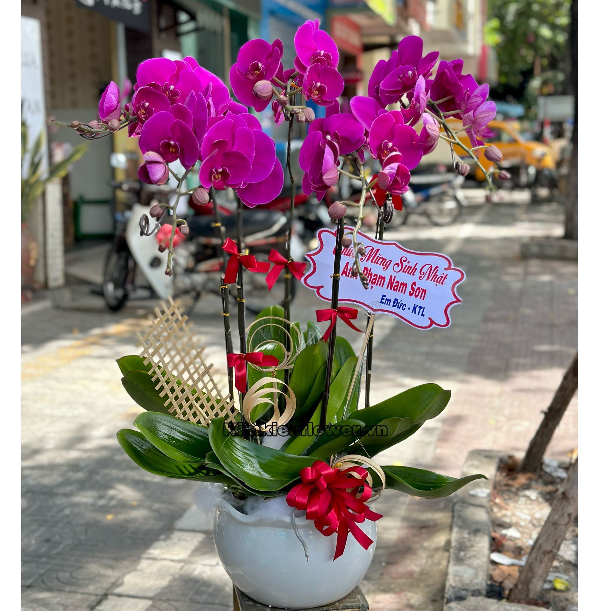 Mẫu HĐ25: gồm các loại hoa + 5 cây lan hồ điệp tím + Liên hệ KIM KIỀU FLOWER để tư vấn thiết kế mẫu hoa theo yêu cầu bạn nhé!