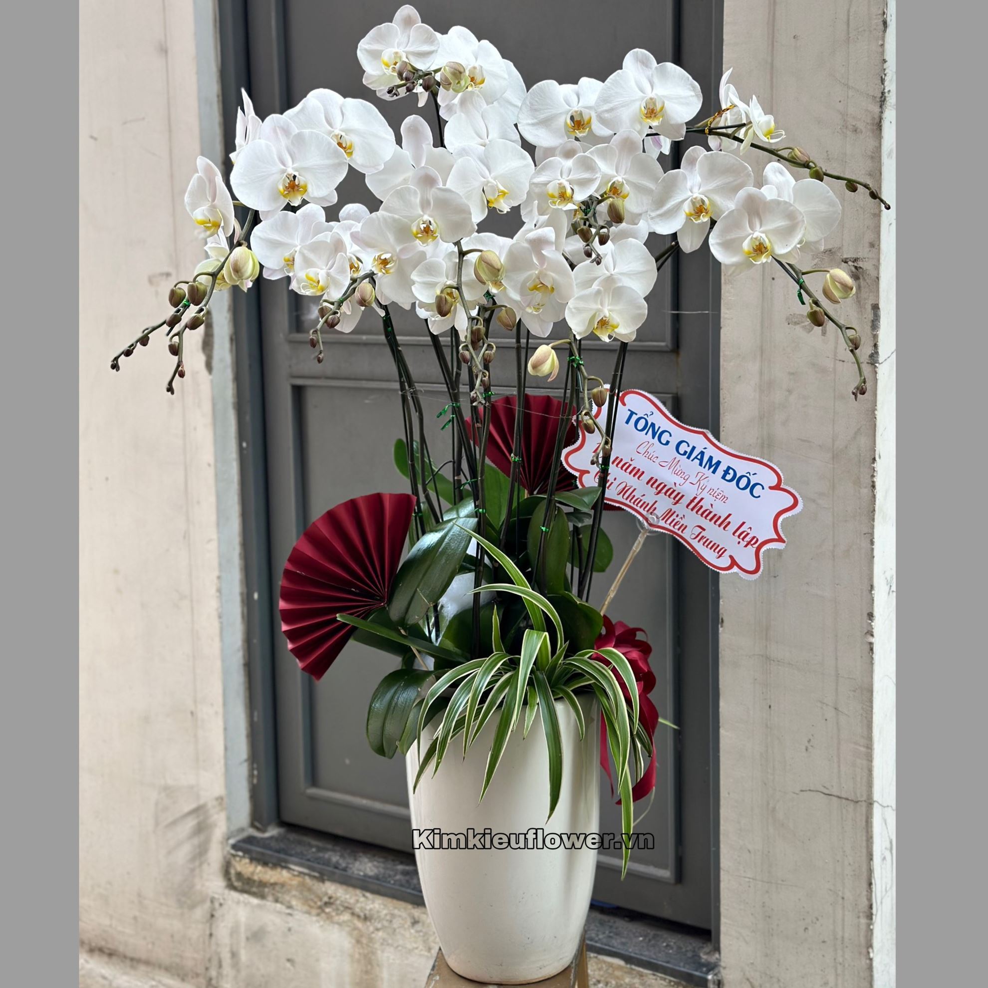 Đã bao giờ bạn xao xuyến trước vẻ đẹp của cành liễu la đà lơ lửng trên mặt nước chưa, những bông lan hồ điệp trắng muốt, tinh khiết lơ lửng đã làm chúng ta liên tưởng tới những cành liễu ấy. Chậu hoa thích hợp tặng vào những dịp sinh nhật, khai trương, làm quà tặng, hoặc đặt ở các đại sảnh, văn phòng... Mẫu HDD24 gồm các loại hoa : + 5 cây lan hồ điệp trắng ( 2 vòi ) + và các hoa,lá phụ khác- Liên hệ KIM KIỀU FLOWER để tư vấn thiết kế mẫu hoa theo yêu cầu bạn nhé!
