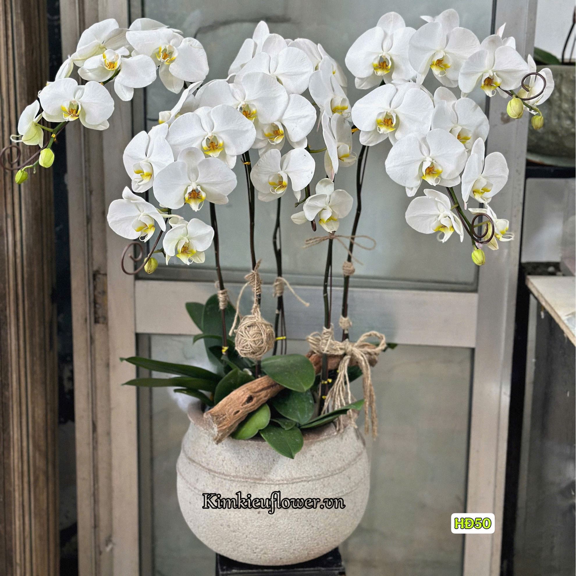 Mẫu HĐ50 gồm các loại hoa: + 5 cây lan hồ điệp trắng + Liên hệ KIM KIỀU FLOWER để tư vấn thiết kế mẫu hoa theo yêu cầu bạn nhé!
