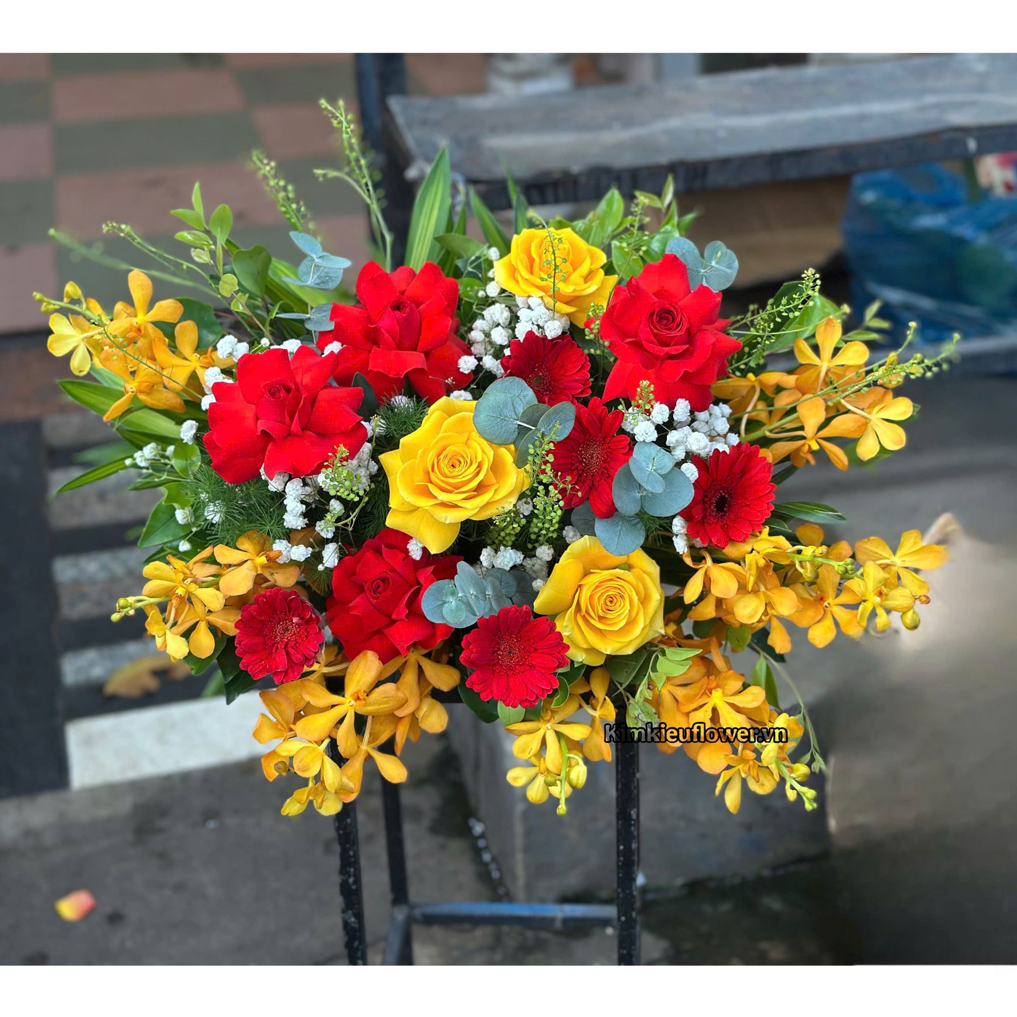 Đĩa hoa bục phát biểu tone đỏ vàng - ĐH61
