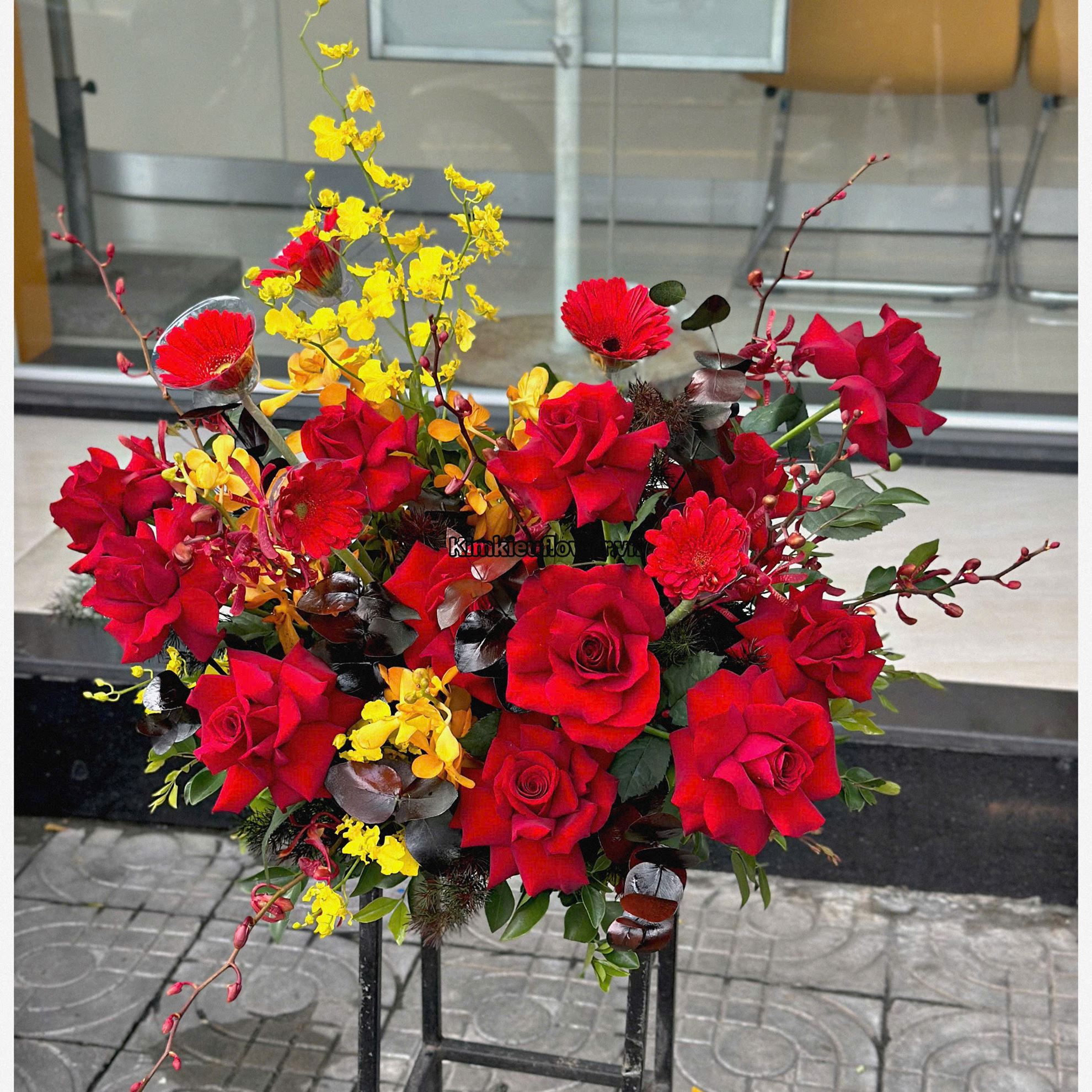 Đĩa hoa chúc mừng tone đỏ vàng mix lan vũ nữ - ĐH62