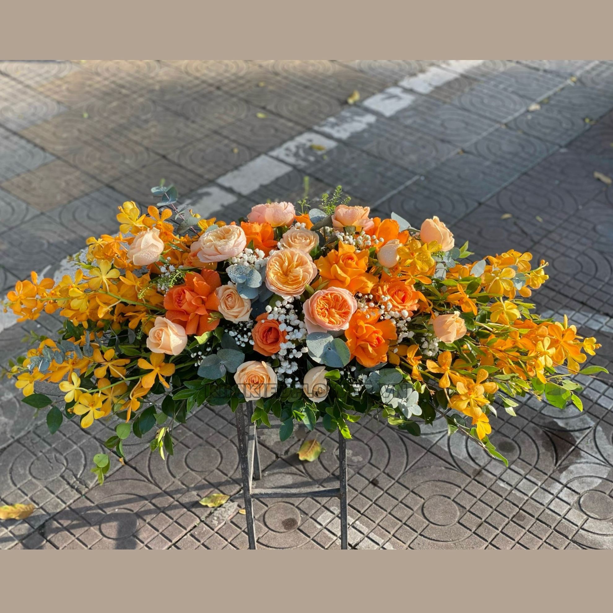 Mẫu ĐH24 gồm các loại hoa : + victo hồng + hoa hồng cam + lan vàng + hoa hồng mỡ gà + và các lá phụ khác - Liên hệ KIM KIỀU FLOWER để tư vấn thiết kế mẫu hoa theo yêu cầu bạn nhé!