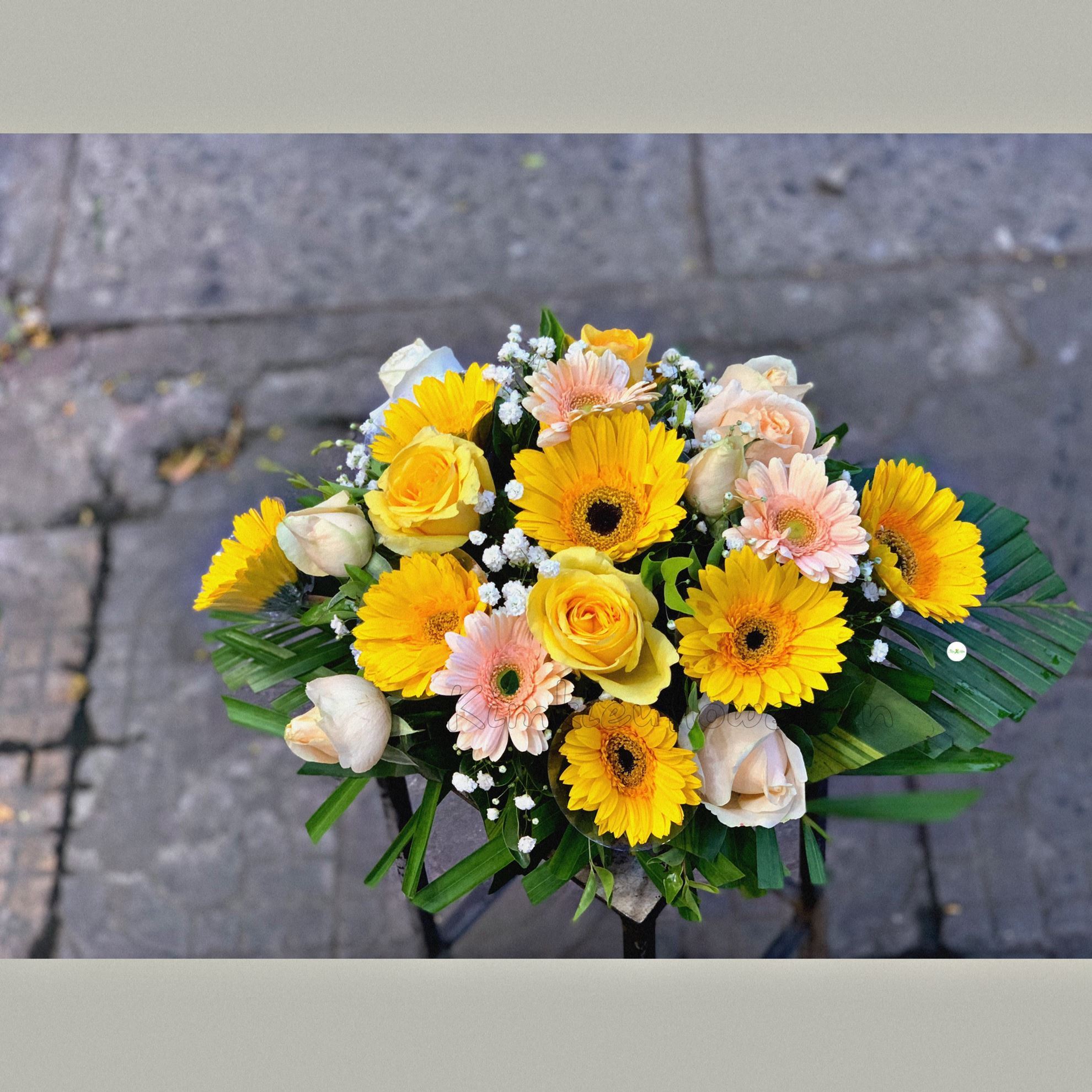 Mẫu ĐH05 gồm các loại hoa : + hoa hồng vàng + hoa hồng mỡ gà + đồng tiền vàng + và các lá phụ khác- Liên hệ KIM KIỀU FLOWER để tư vấn thiết kế mẫu hoa theo yêu cầu bạn nhé!