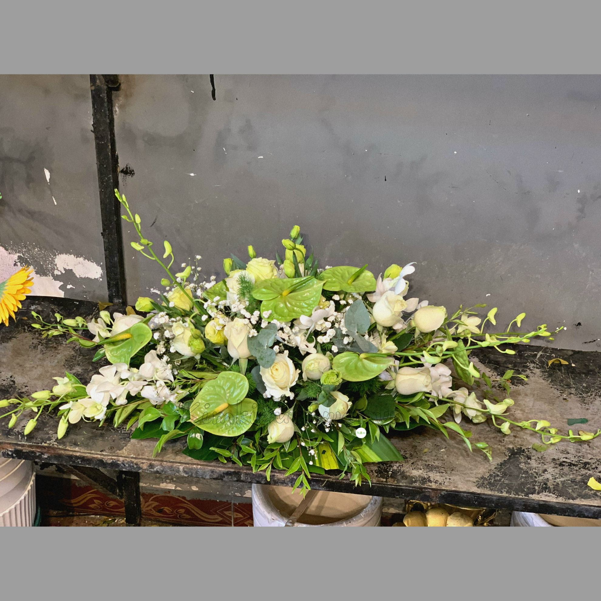 Mẫu ĐH07 gồm các loại hoa: + hoa hồng trắng + môn xanh + lan trắng + và các lá phụ khác- Liên hệ KIM KIỀU FLOWER để tư vấn thiết kế mẫu hoa theo yêu cầu bạn nhé!